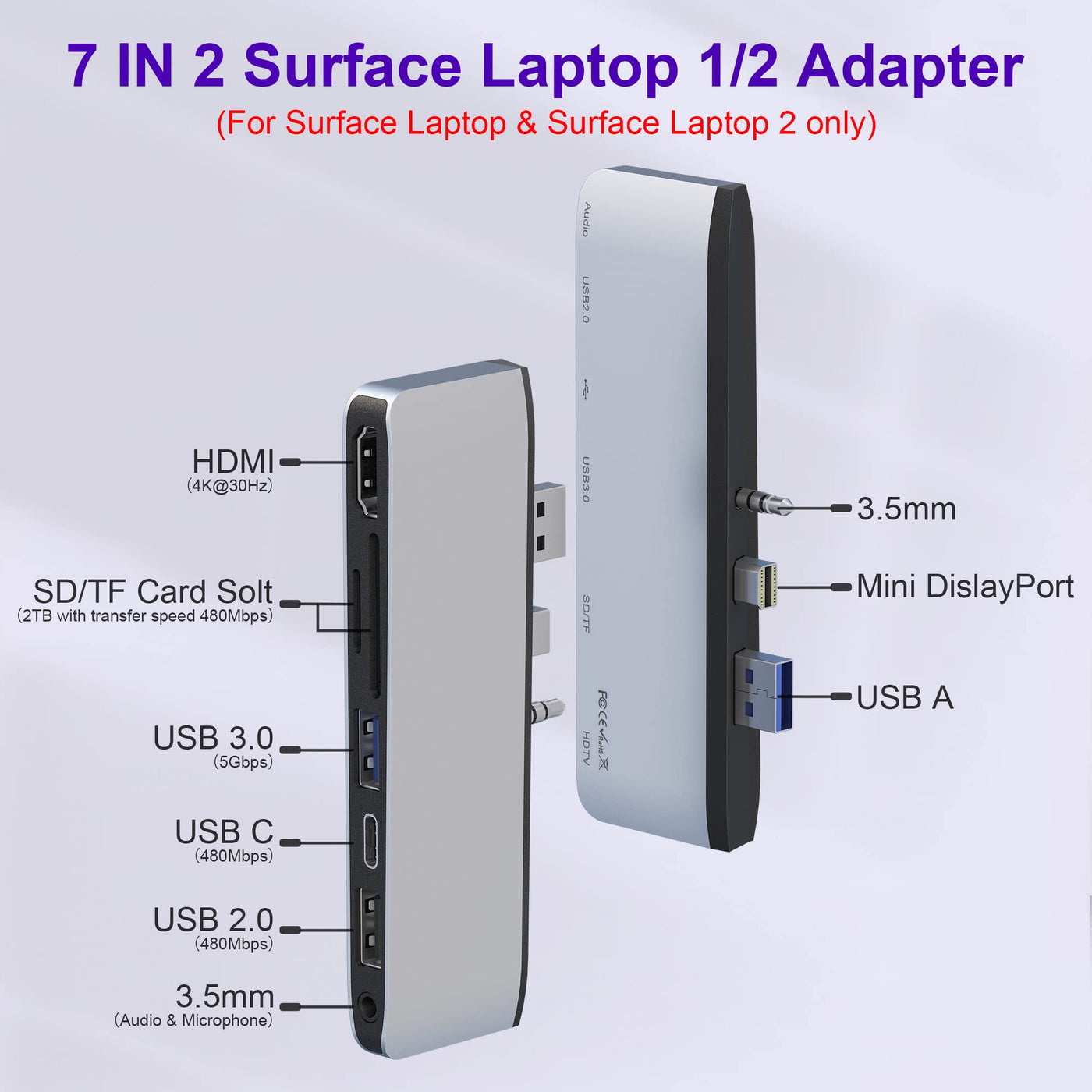 Premium 7-In-1 Adapter For Surface Laptop 1/2, High-Speed, High-Definition Surface Laptop 1/2 Adapter'S Compatibility List: Surface Laptop 1 Surface Laptop 2 Specifications: Hdmi Port-Up To 4K 30Hz Usb 3.0 Ports-5Gbp/S Data Speed Usb 2.0 Ports-480Mbp/S Data Speed Usb C Ports-480Mbp/S Data Speed Micro Sd/Sd Card Reader-Up To 480Mbp/S 3.5Mm Audio Port Supports Headphone Input And Output. Attention: 1. This Adapter Is Not Suitable For Wearing A Protective Case. 2. It Is Not Recommended To Use Usb 3.0 Type-A Ports, Usb 2.0 Type-A Ports, And Usb 2.0 Type-C Ports For Charging. 3. Port Type Is Applicable: Usb A + Mini Displayport + 3.5Mm Port Type Is Not Applicable: Usb A + Usb C + 3.5Mm 4.This Adapter Is Only Compatible With Surface Laptop 1/2, Not Compatible With Surface Laptop 3/4/Go. Please Check Your Surface Model Before Your Purchase. 4K High Definition Surface Laptop 1/2 Hub Adapter 4K Hdmi Output Support Resolutions Up To 3840X2160P@30Hz And Freely Show Your Laptop'S High-Resolution Display On Most Hdtv, Monitors, Or Projector. Confirm Whether The Resolution Of The Monitor Can Reach The Corresponding Requirements Before You Use It. Usb 3.0 High-Speed Data Transmission Our Surface Laptop 1/2 Docking Station Build With Usb 3.0 Type-A Ports, Transfer Speed Up To 5Gbps,10X Fast Than A Usb 2.0 Hub. Transfer Videos And Images Just In Seconds, Saving Your Time. Giving Seamless Access To Usb 3.0 Wired Keyboard, Mouse, Usb Flash Drive, Hard Disk, Etc. Backward Compatible With Usb 2.0/1.0 Devices. 3.5Mm Audio Interface Surface Laptop 1/2 Hub Adapter 3.5Mm Audio Port Supports International/American Standard Headphone Input And Output. Sd/Tf Card Reader Convenient Sd/Tf Card Reader (Speed Up To 480 Mbp/S) For Your Surface Laptop 1/2 To Access Files From Sd/Tf Card Reader, Quickly View Your Photos Or Videos, Perfect For Photographer Or Designer, Etc; Sd/ Tf Card Reader Can'T Work At The Same Time. Perfect Match Surface Laptop1/2 The Aluminum Alloy Design Matches Your Surface Laptop1/2 Perfectly And Is Remarkably Durable; The Extremely Compact Design Makes It Easy To Carry. Plug And Play The Special Bevel-Side And Compact Design Of This Usb Hub Perfectly Match Your Surface Laptop1/2 And The Wireless Design Make Your Desktop More Clean And Organized. Lightweight Is Convenient For Travel Or Business Trip. Really Good Idea For Surface Work For Windows 11,10,8,7, Xp System. What'S Your Get: 1X Surface Laptop 1/2 Docking Station