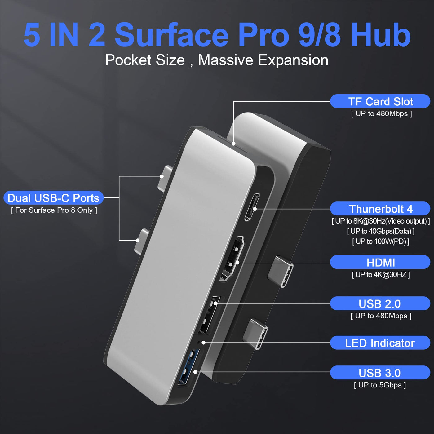 Microsoft Surface Pro 8 Hub Docking Station,5-In-2 Surface Pro 8 Accessories With Usb C Port (Audio+Data+100W Pd Charging)*1,Ultra 4K Hdmi*1,Usb 3.0*1,Usb 2.0*1,Tf Card Reader*1, Triple Display For Microsoft Surface Pro 8-Silver