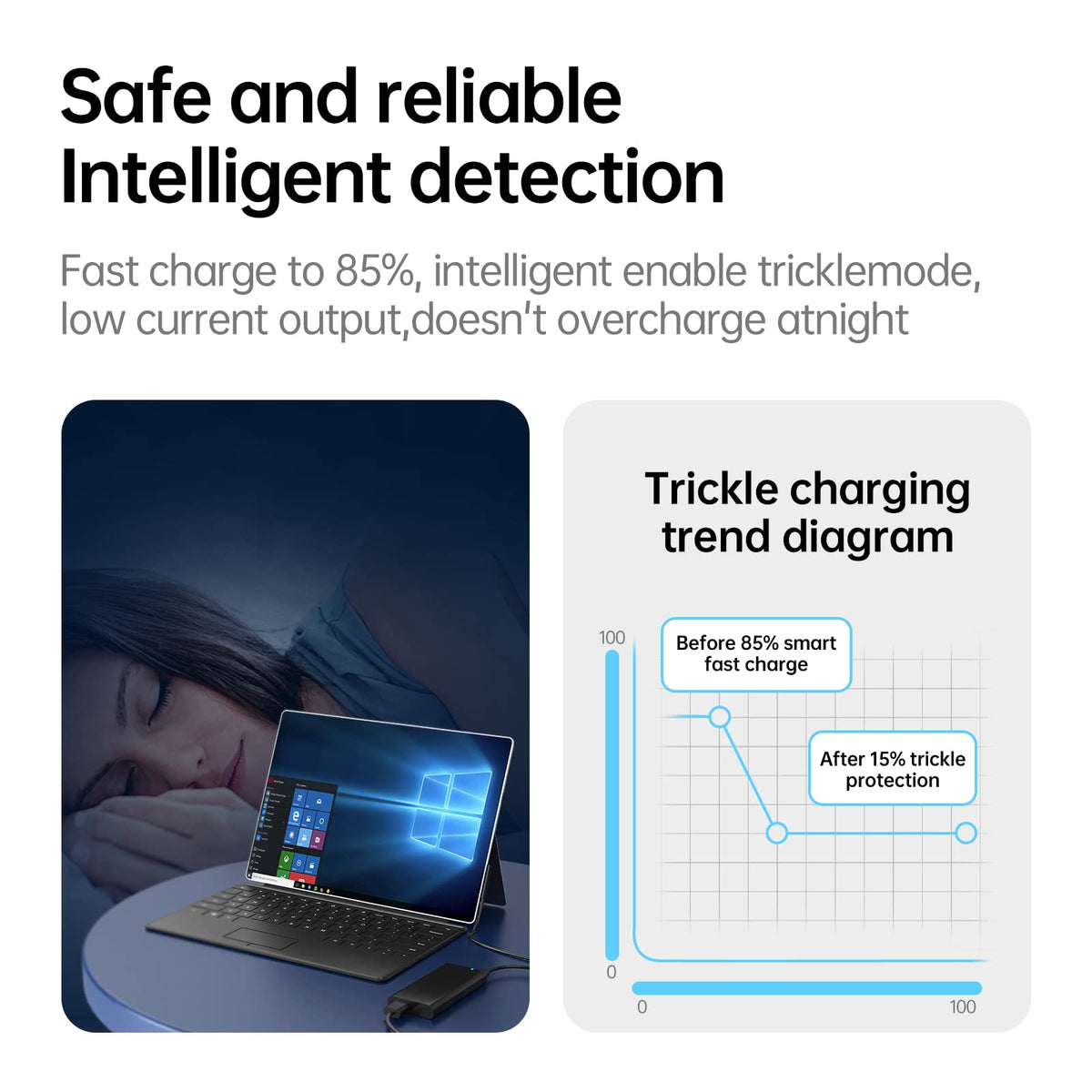 Q: How does the SOURNOVA Surface Pro Charger ensure safety during charging?A: The charger is equipped with original dynamic software and hardware systems that intelligently monitor your charging routine, reducing battery aging, and preventing overcharging, overheating, short-circuiting, and sparks to ensure your device's safety.