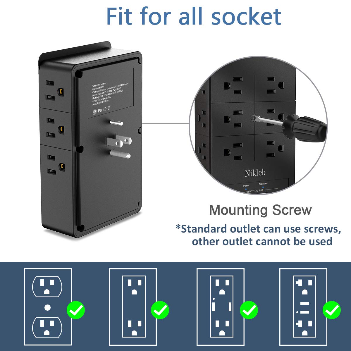 Outlet Covers For Electronic Equipment: Outlet Splitter Heavy Duty, Supports 16 Electrical Devices Simultaneously, Covers And Protects Your Wall Socket At The Same Time, Tailored Size, Screw Offered For Reinforcement. | Tech Gadgets Space Saving: 4 Usb + 12 Outlet Extender, Surge Protector 24H, Wide Spaced Outlets, Cordless Power Strip With Usb, Offers Extension With Extra Outlets For Room, Garage, Basement, Office, Bathroom, Kitchen, Ect. | Charger Block Organizers Home Improvement: 4 Usb Charging Ports With Top Phone Holder Design, Usb Outlets Receptacles Wall Mountable, Power Surge Tower For Men, Women, Teen, Kids Room, Usb Wall Charger With Indicator. | Multiple Outlet Wall Plug Safety Warranted: Fireproof Material, Surge Protection 1080J Plus Grounded Protection, Overload Protection, Short-Circuit Protection, Over Current Protection, Over-Voltage Protection And Overheating Protection. | What You Will Save With Nikleb Outlet Extender: A Power Strip, A Surge Protector, 4 Usb Chargers, A Plug Adapter. What You Will Get: A Multi Plug Outlet Extender 12 Outlets + 4 Usb Ports, Screw Offered For Mounting.