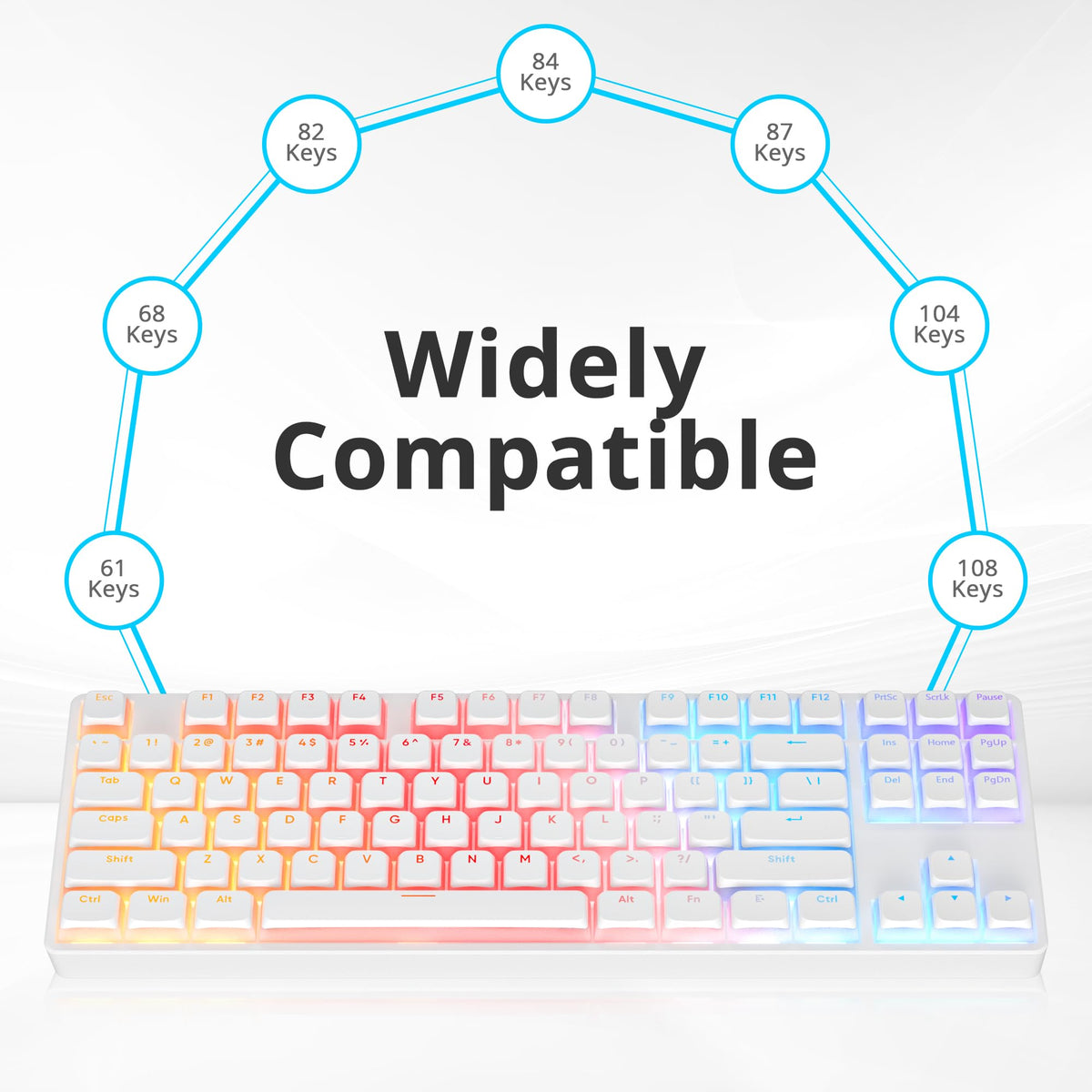 ? Colorful - The Translucent Dual Layer Design Lets More Light Shine Through To Highlight The Rgb Effects Of Your Gaming Keyboard. Perfectly Readable Legends And A Milky Base Make This The Perfect Gaming Accessory For Playing With A Backlit Keyboard. ? Fits Multiple Sizes - The Keycap Set Has 108 Included Keys And Fits Most 104, 87, 84, 82 And 60% Keyboards And Is Compatible With Ansi Us Layout As Well As The European Iso Layout. ? Durable Quality - The Keycaps Are Made From Doubleshot Pbt Material That Is Very Durable And Pleasant To Touch. Resistant To Wear ?High Compatibility - The Keycaps Are Widely Compatible With Cherry Mx Switches, Gateron Switches, Kailh Box Switches And Outemu Switches.