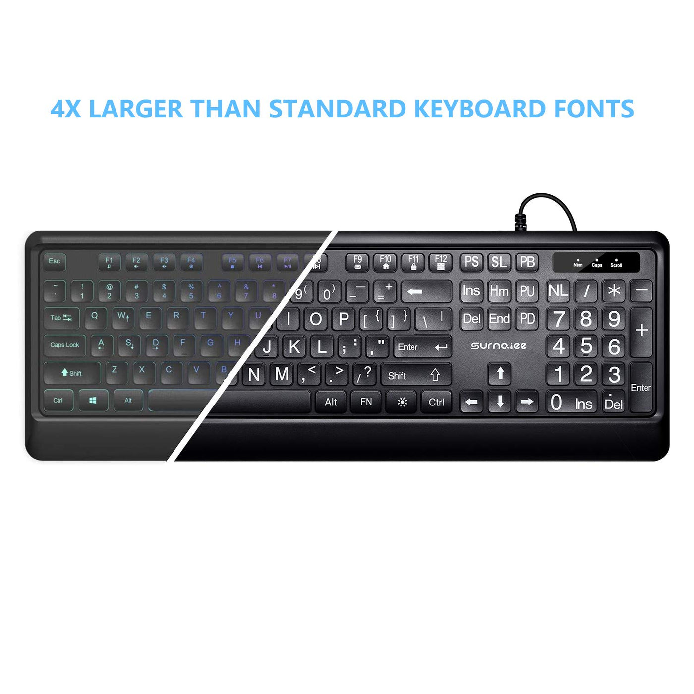 Q: What are the main features of the SurnQiee Large Letter Print Keyboard?A: The SurnQiee Large Letter Print Keyboard features large print keys that are 4X larger than standard fonts, making it easier for those with vision impairments to see. It also has customizable white LED backlighting, multimedia function keys for quick access, and a plug-and-play USB connection for easy installation.