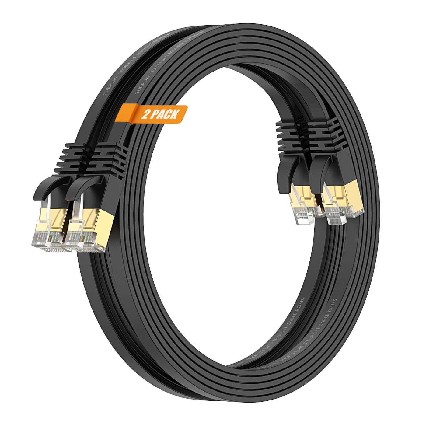 Surplay Cat7 2Pack 6Ft Ethernet Cable Black 10Gbps Shielded & Ground Wire Internet Network Flat Patch Cord,Ultra Slim Gold Plate