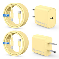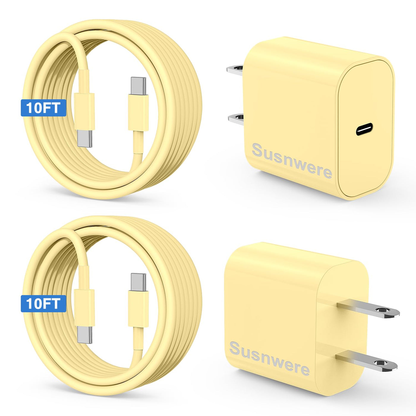 Susnwere Iphone 15 Charger 10 Ft With 20W Usb C Charger Block,2 Pack 20W Fast Wall Charger For 15/15 Pro/Pro Max/Ipad Pro Airpods/Samsung And More, With 2 Pack 10Ft Usb C Cable, Yellow