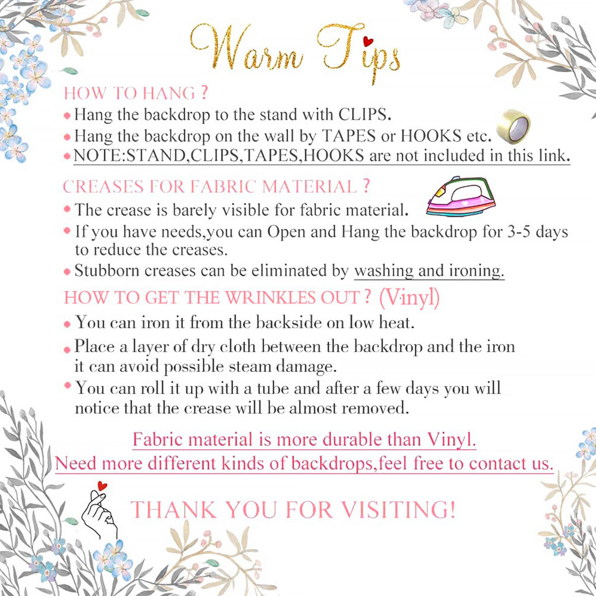 Q: How should I care for the backdrop to maintain its quality?A: To keep the backdrop in good condition, avoid exposing it to direct sunlight for extended periods. If it gets wrinkled, you can iron it on low heat or hang it to let the wrinkles fall out naturally.