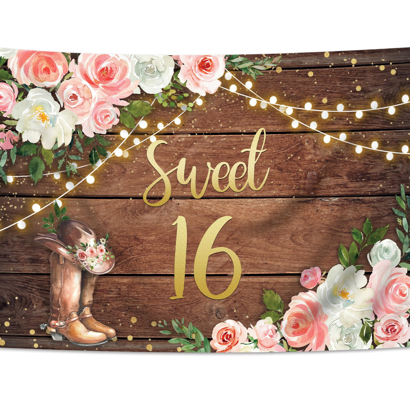 Svbright Sweet 16 Backdrop 7Wx5H Western Cowgirl Happy Birthday Rustic Country Wood Plank Pink White Floral Flower Rose Retro Bo