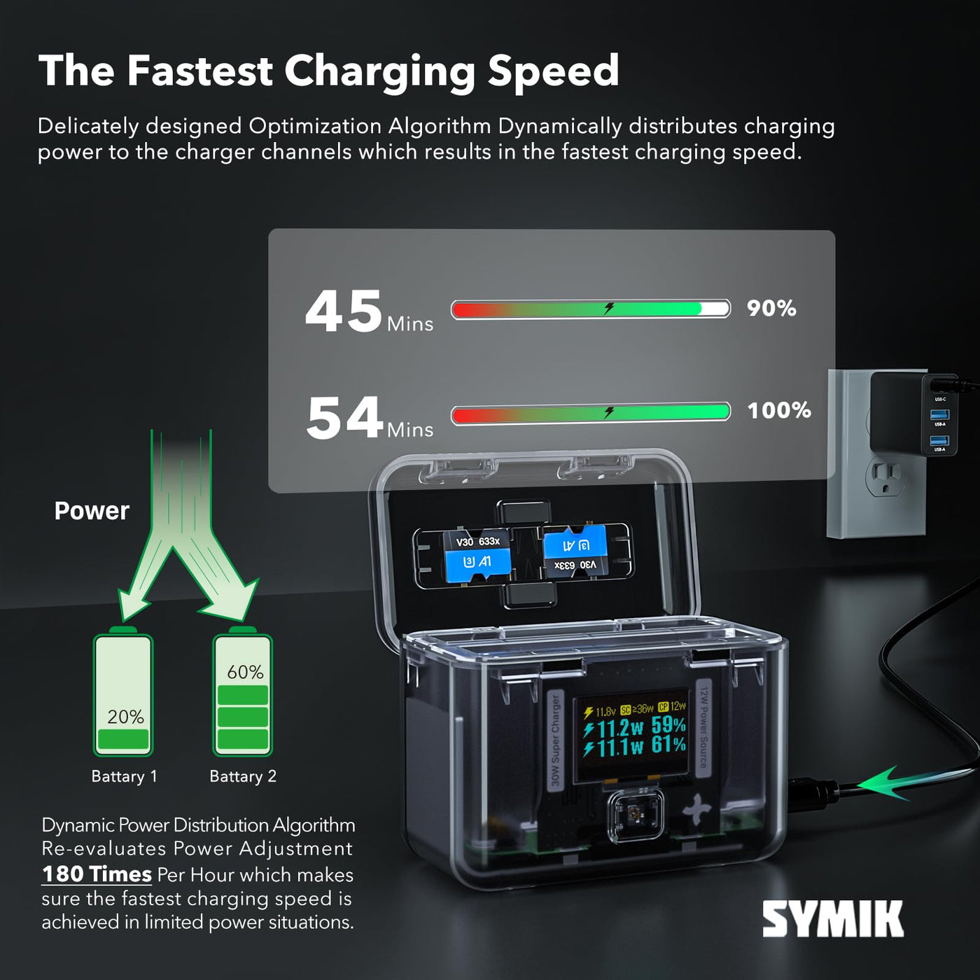 Q: How fast can the SYMIK Fast Charge Hub charge my batteries?A: The SYMIK Fast Charge Hub can charge two batteries from 20% to 95% in just 35 minutes, and from 0% to 100% in 54 minutes under optimal conditions.