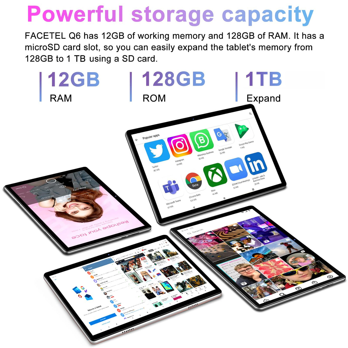 Powerful Octa-Core Processor And Latest Android 13 Tabletthe Facetel Q6 Tablet Is Equipped With An Octa-Core Processor, Operating At A Frequency Of Up To 2.0 Ghz. The Latest Android 13 Provides A More Personalized, Secure, And Effortless Experience.5G Wifi Can Run Simultaneously, Allowing You To Keep Your Tablet Running At High Speed In Any Situation.Built In Dual Speakers, Whether You'Re Playing Or Watching A Movie, The Facetel Q6 Tablet Will Make You Feel Like It'S Worth It.Facetel Q6 Is Designed With An Octa-Core 2.0 Ghz Processor. Whether You Are Watching Videos, Or Listening To Music, Your Experience Will Be Perfect.12 (6+6) Gb Ram Allows For Smooth Transitions Between Applications. 128Gb Rom Fast Memory Allows You To Store All Files. Expanding With Micro Sd Card Can Reach Up To 1Tb Of Expandable Memory To Obtain More Storage Space.Brand: Facetelsystem: Android 13Processor: 2.0 Ghz Octa-Corememory: 12Gb (6+6) Ram+128Gb Rom/Tf 1Tb Expandable Memoryscreen: 10.1 Inchesresolution: 1280 * 800Network: 2.4G+5G Dual Band Wificamera: 8 Mp Rear Camera, 5 Mp Front Camerabattery: 6000Mahwhat'S In The Box?10.1-Inch Android 13 Tablet X1Tablet Charger X1Bluetooth Keyboard X1Bluetooth Mouse X1Tablet Leather Case X1Tablet Three-Layer Protective Film X1Sd Picker X1User Manual&Nbsp;X1&Nbsp;Note: Q6 Tablets Do Not Support Sim Cards !