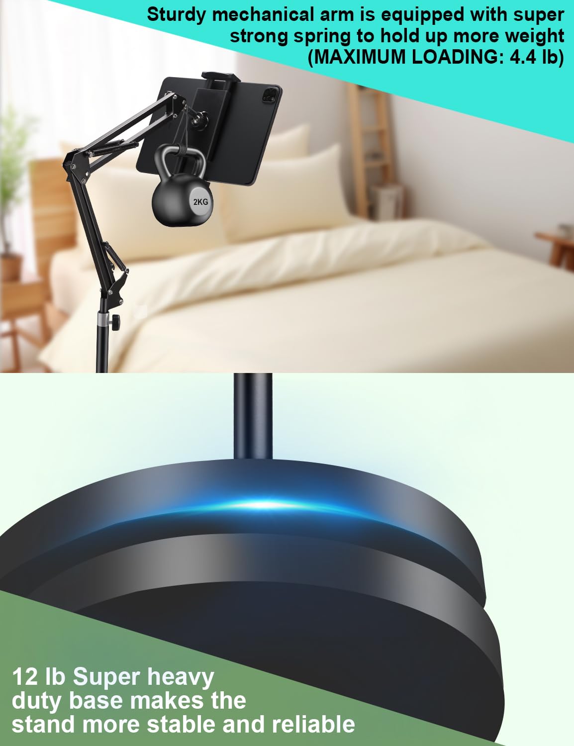 Tablet Floor Stand, Overhead Bed Phone Stand Angle/Height Adjustable &12 Lb Super Stable Base, E Books Stand Compatible With Iph