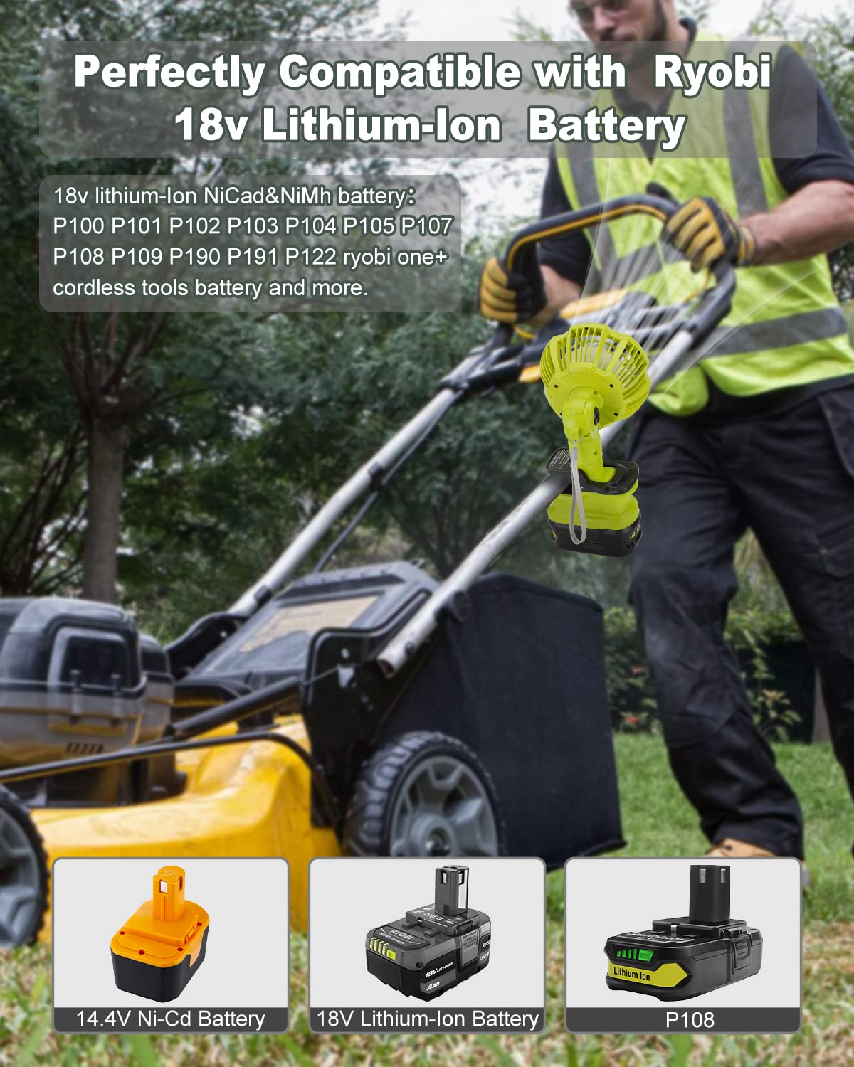 Q: What type of battery is compatible with the Taingwei Portable Clip on Fan?A: The Taingwei Portable Clip on Fan is compatible with Ryobi ONE+ 18V batteries, allowing for cordless operation. Ensure you use the correct model, such as the PBP005 4.0AH battery, for optimal performance.