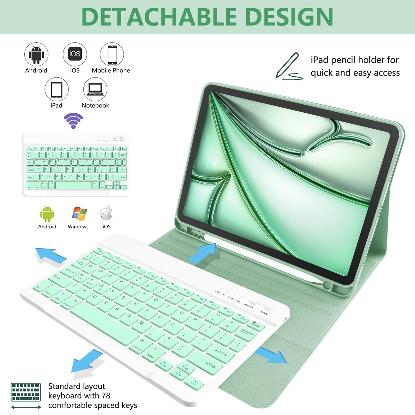For New Ipad Air 11-Inch M2/ For Ipad Air 5Th 4Th Generation 10.9 Keyboard Case 2020, Detachable Wireless Bluetooth Keyboard, Cover Case For Ipad 11 Pro 2018, For Ipad Air 4 Gen, With Build-In Pencil Holder -- Black Description: Sturdy And Attractive Design.The Ipad Fits Snugly Into The Leather Case And Provide Sufficient Protections For Daily Use. For Ipad 10.9 /11 Pro 2018 Keyboard Case Comes With A Slot For Holding Your Apple Pencil Stylus That Lets You Effortlessly Reach For Your Pen Whenever You Want To Use The Touch Pen Function.(Apple Pencil Is Not Included) A Protective Cover And Real, Quiet Keyboard Support 3 Use Modes - Typing, Viewing, Reading - Giving You Amazing Versatility. It Allows You To Prop The For Ipad Up For Watching Videos. For Ipad Air 4 Case Support Apple Pencil Pair And Wireless Charging Without Taking Off The Case. Bluetooth Keyboard Is Responsive And Held Into The Case By A Magnet. Perfect Access To All Ports/Buttons And Camera. How To Connect: Turn On The Keyboard Power. (The Power Indicator Will Flash About 2 Seconds Then Goes Off, This Is Normal) Press ''Connect'' Button On The Keyboard Into Bluetooth Matching Condition. Open Your Bluetooth , Search For The Keyboard. Click ''Bt 3.0 Keyboard'', It Will Show A Pairing Code In The Screen, You Need To Input It On The Keyboard Then Press ''Enter'', It Will Be Connect. (If There Have Not Show The Pairing Code, You Not Need To Input It) Packing List: 1X Keyboard Case For Ipad Air 4Th Gen 10.9 Inch 1X Micro Usb 2.0 Cable(Only For The Keyboard) 1X User Manual