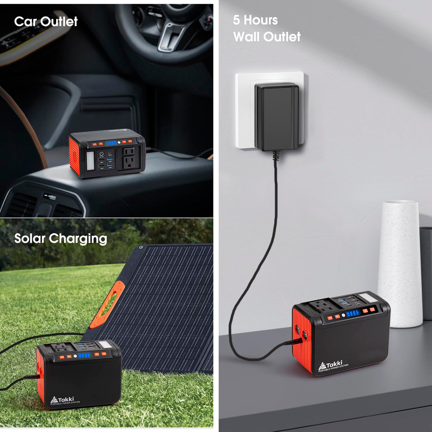 Q: What charging methods are available for the power station?A: The Takki Portable Power Station can be charged using AC adapters or solar panels (15-25 volts), making it versatile for indoor and outdoor charging options.