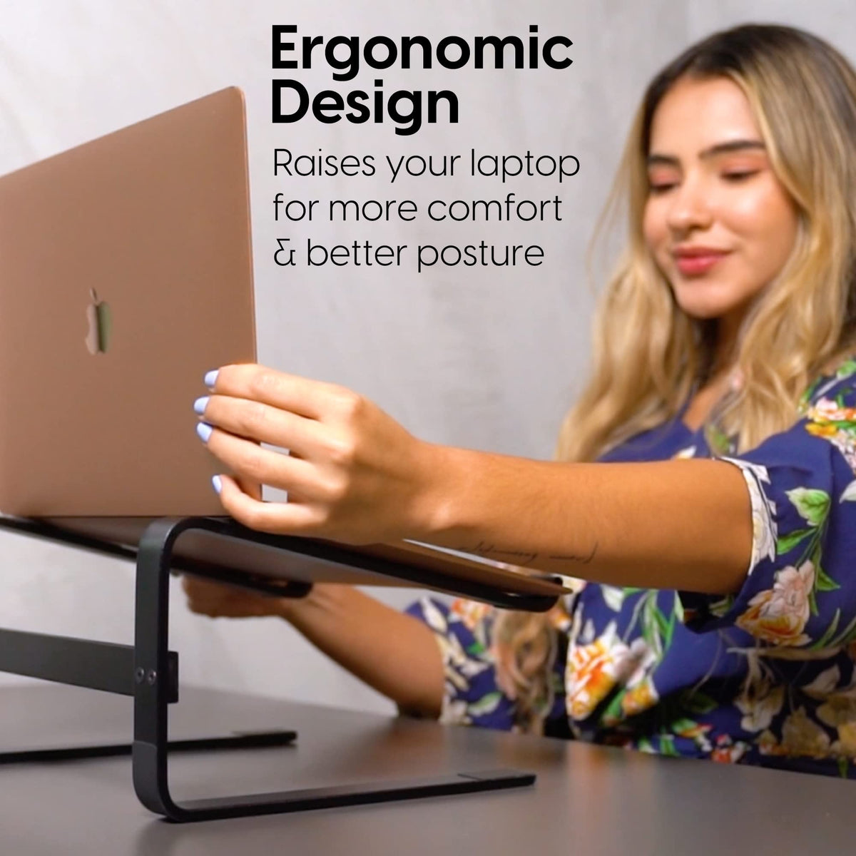 Q: How does the laptop stand improve posture and viewing angle?A: This laptop stand elevates your device, promoting better posture and providing a more comfortable viewing angle, which helps reduce strain on your neck and back during prolonged use.
