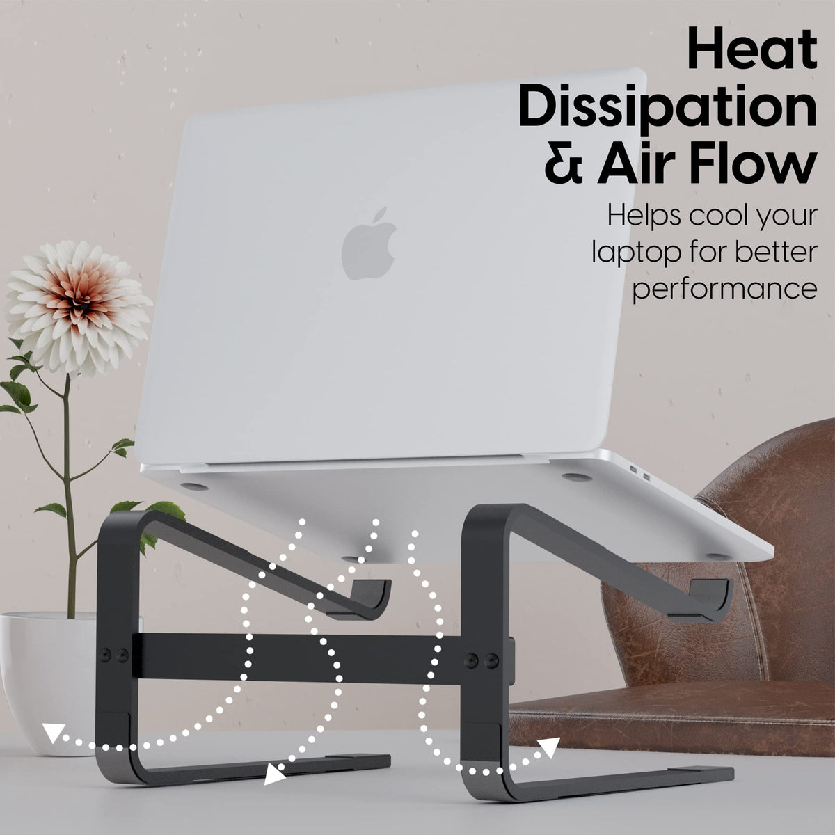 Q: Does the laptop stand help with laptop cooling?A: Yes, the open base design of the monitor stand promotes better airflow around your laptop, helping to keep it cool and eliminating the need for an additional cooling fan.