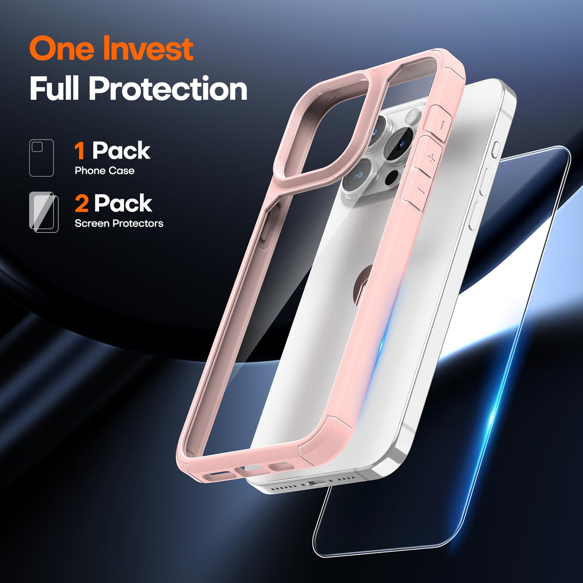 Tauri 3 In 1 For Iphone 15 Pro Case Pink, [Not-Yellowing] With 2X Screen Protector [Military Grade Drop Protection] Slim Shockproof Case For Iphone 15 Pro