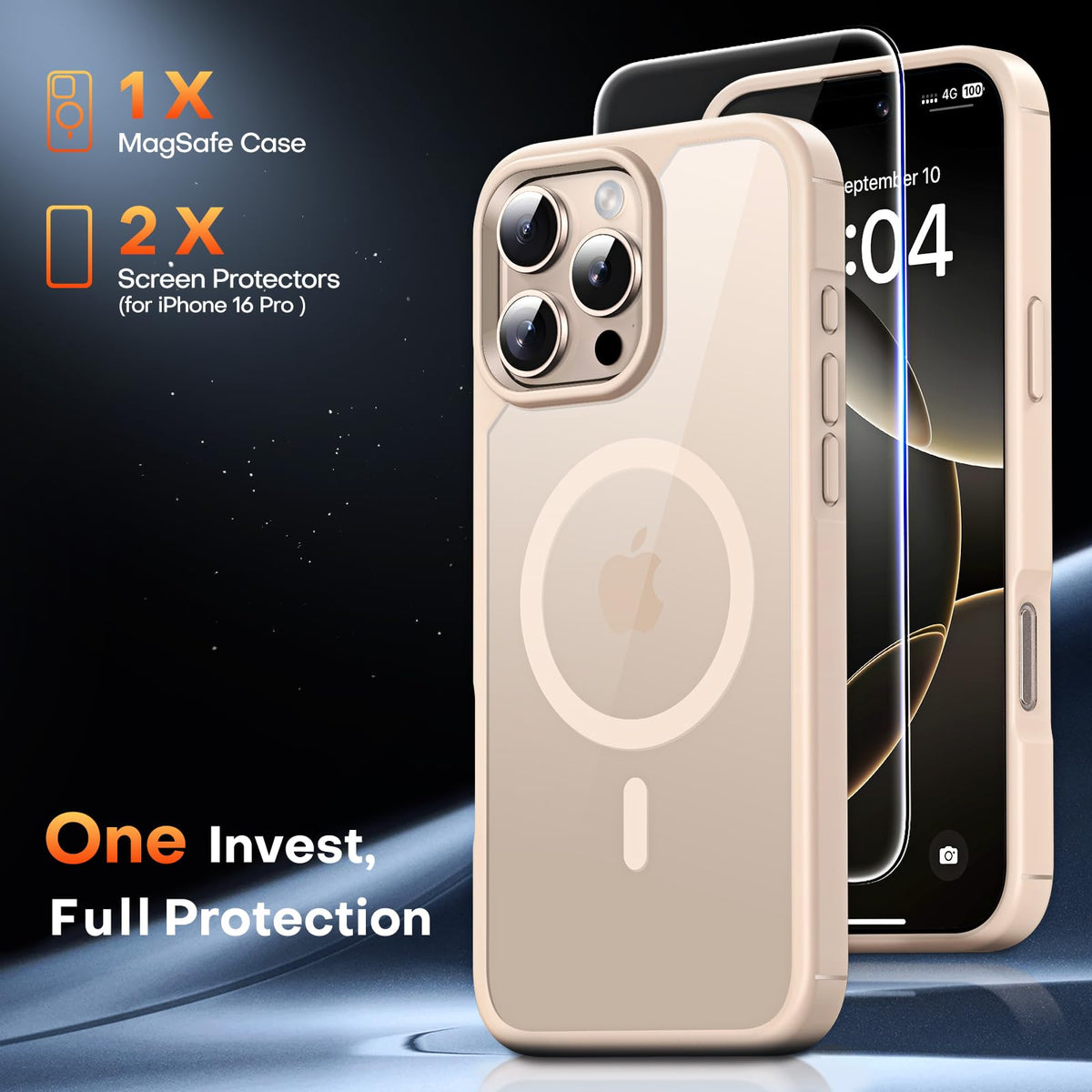 Tauri 3 In 1 For Iphone 16 Pro Case, Compatible With Magsafe [Not-Yellowing] With 2X Screen Protectors, Military-Grade Protection, Slim Magnetic Case For 16 Pro 6.3'', Desert