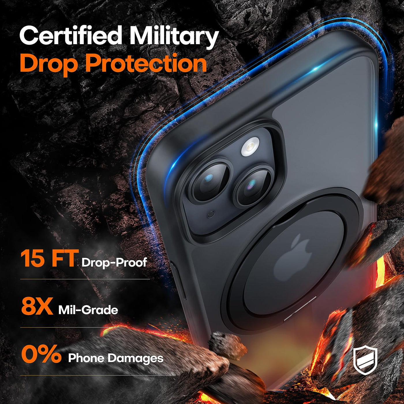 Q: How does the 360° rotatable ring stand work?A: The 360° rotatable ring stand allows you to easily prop your phone up vertically or horizontally for various activities such as watching videos, video calls, or browsing. When not in use, the ring folds flat against the case, maintaining a slim profile.