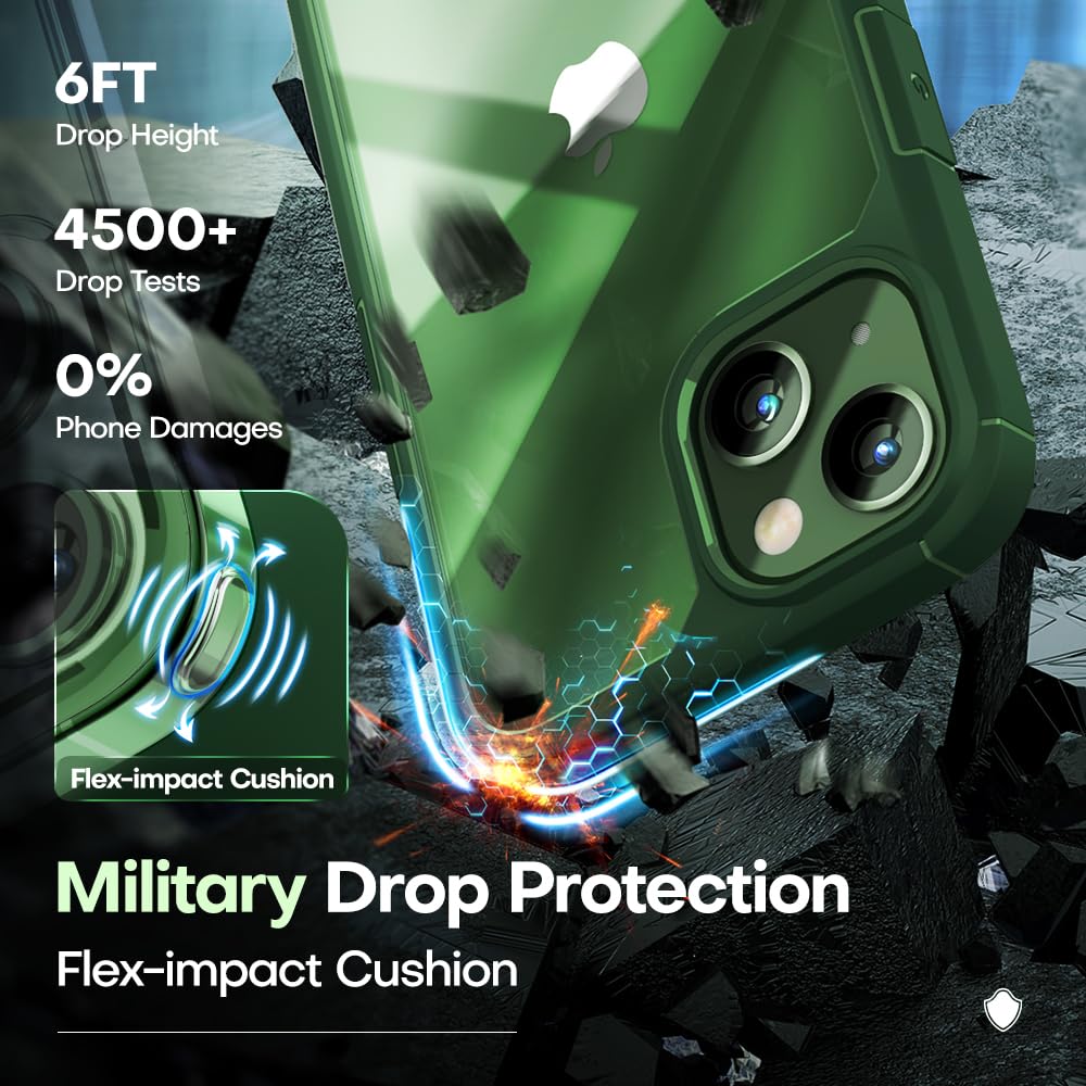 Q: What type of protection does the TAURI 5 in 1 case provide for my iPhone 13?A: The TAURI 5 in 1 case offers military-grade drop protection, designed to absorb shocks and protect your iPhone 13 from scratches, drops, and impacts. Its unique air cushion construction allows it to withstand falls from up to 12 feet.
