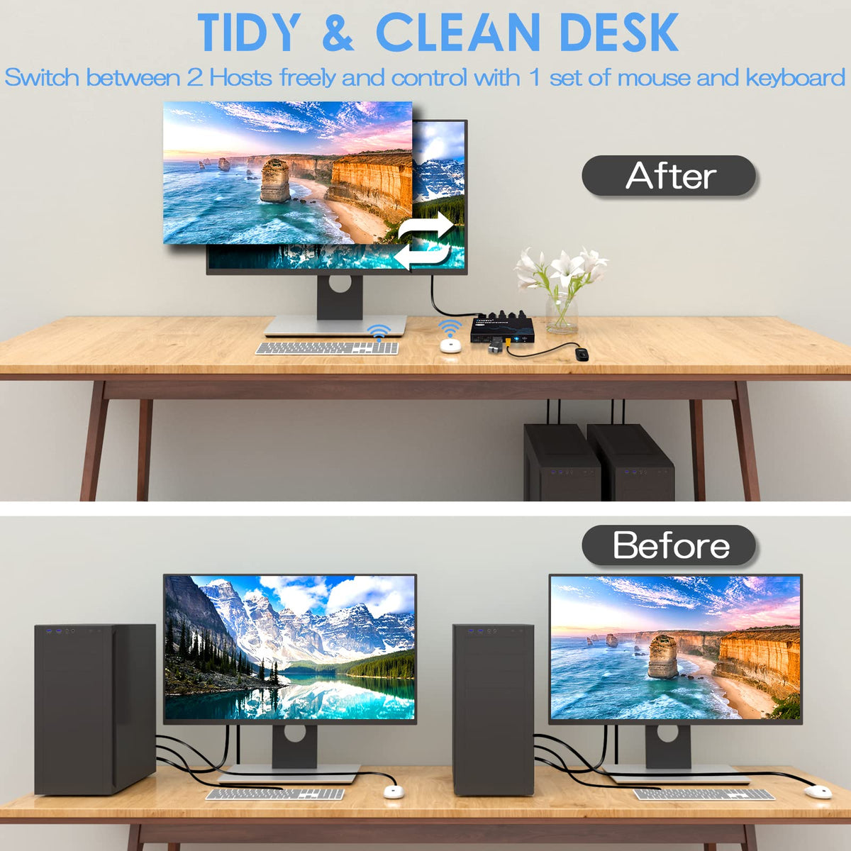Q: What is a KVM switch and how does it work?A: A KVM switch allows you to control multiple computers using a single keyboard, mouse, and monitor. You can easily switch between the connected computers using a button or a wired desktop controller, making it ideal for users who need to manage multiple systems without the hassle of switching cables.