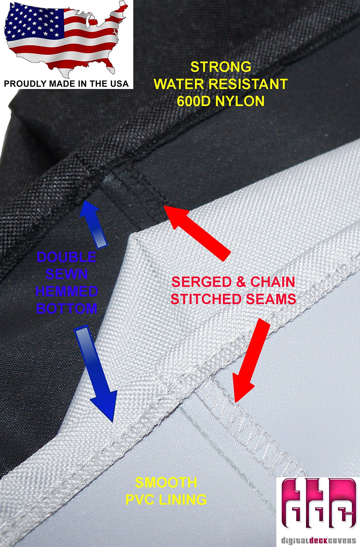 Q: What materials are used in the construction of the dust cover?A: The dust cover is made from high-quality 600D nylon with a PVC vinyl backing. This combination ensures durability and prevents dust from penetrating the fabric, unlike cotton twill or translucent vinyl materials that can allow dust particles to settle.