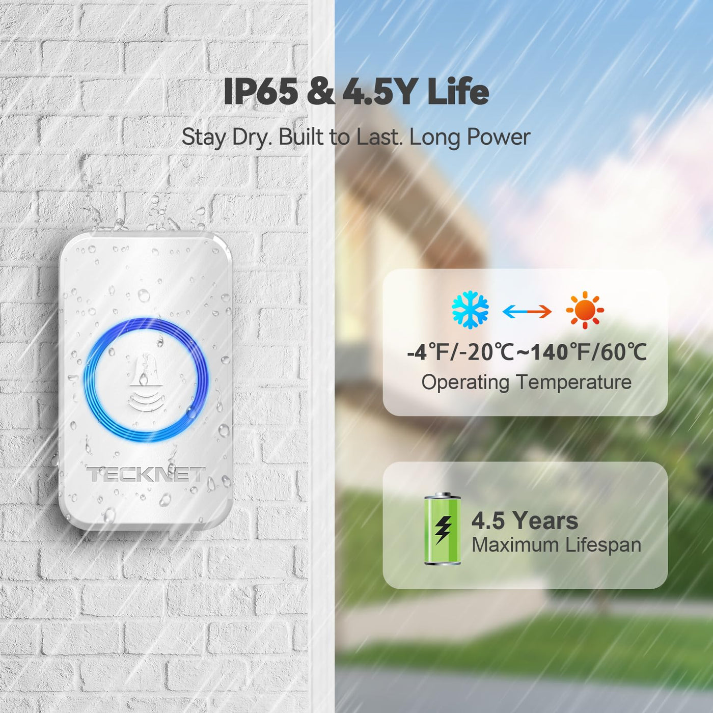 Q: Is the TECKNET Wireless Doorbell waterproof?A: Yes, the TECKNET Wireless Doorbell is rated IP65 waterproof, allowing it to be installed outdoors without a cover, ensuring durability in various weather conditions.