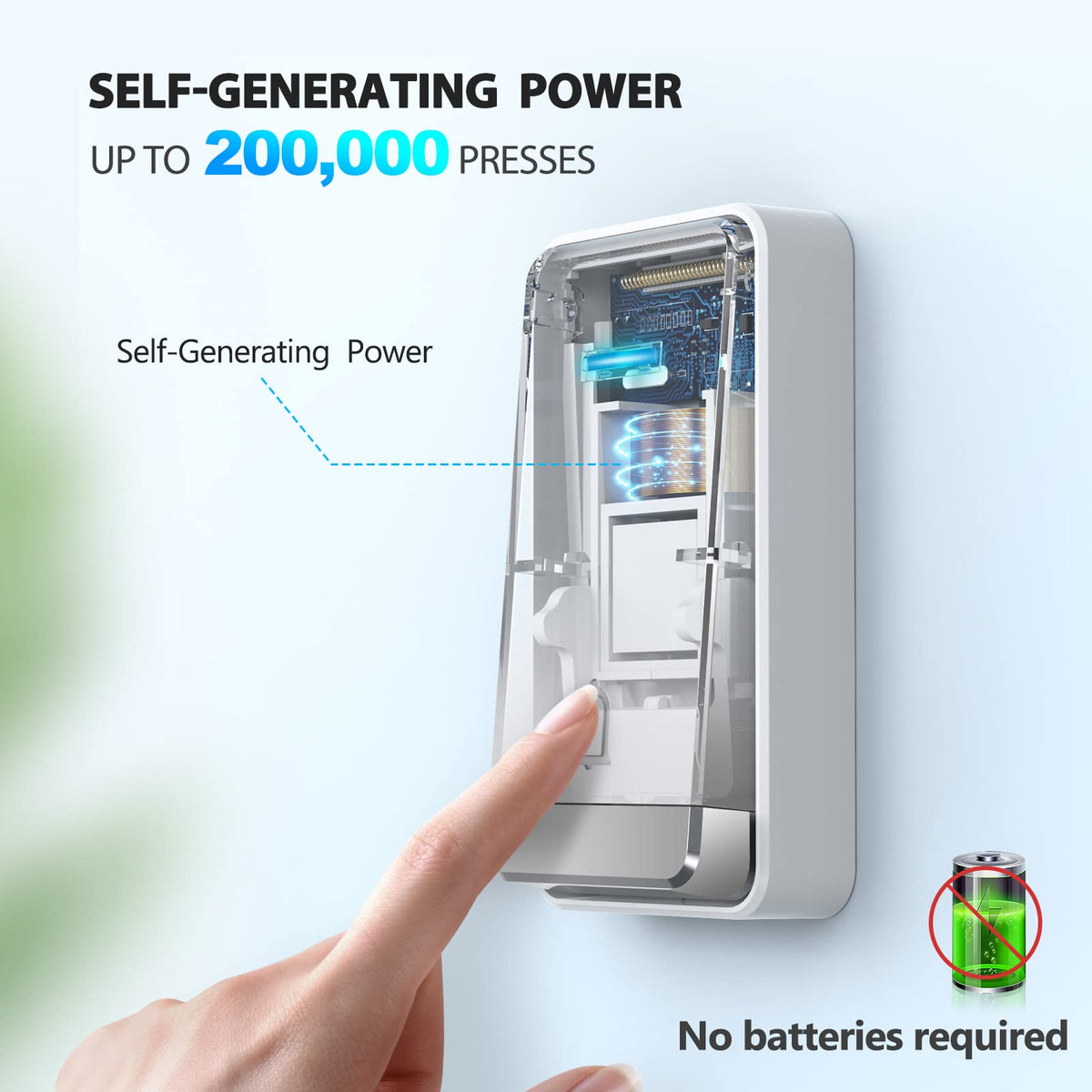 Q: Does the TECKNET Wireless Doorbell require batteries?A: No, this doorbell is self-powered by a micro-generator, which eliminates the need for batteries and ensures a stable and reliable signal.