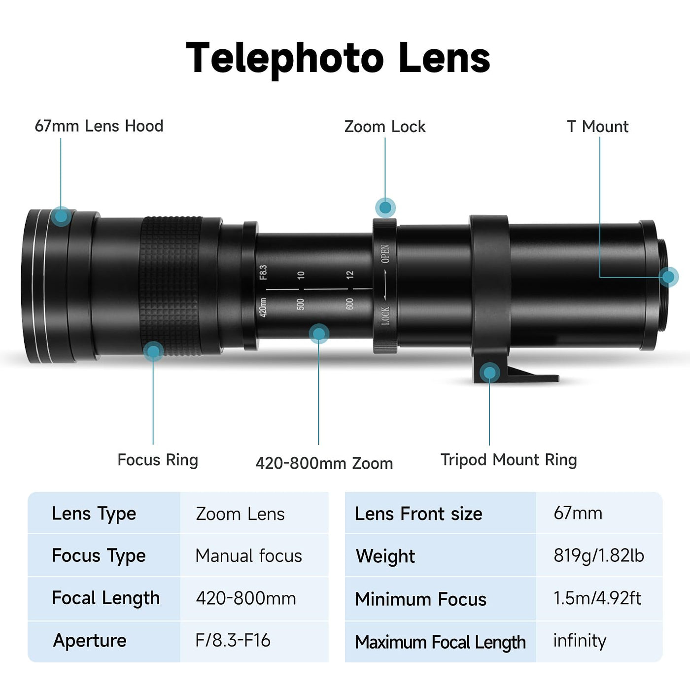 This Jintu High Definition 800Mm Preset Telephoto Lens Is And Incorporates Not Only Computer Optical Design, But Also The Latest Optical Multi-Coating Techniques. The Process Of Multi-Coating Assuresvirtually Flare Free Photographs Even Under Adverse Lighting Conditions Resulting In Crisp, High Contrast Pictures.