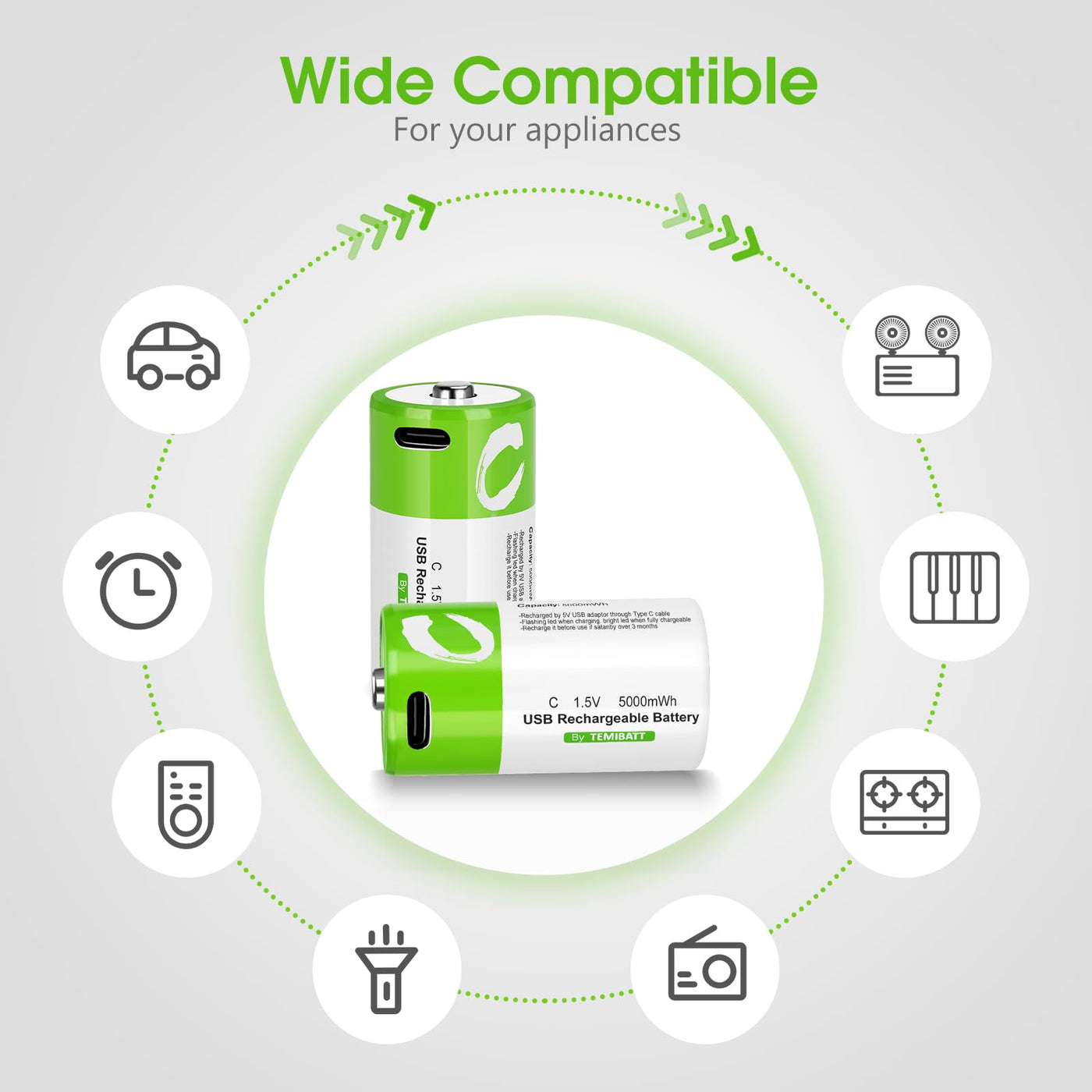 Temibatt Rechargeable C Batteries 8 Pack! High-Capacity Lithium Batteries Are Perfect For Powering Your Television Remote, Toys, Flashlights, And Many Other Devices.Capacity Of 5000 Mwh, They Provide Long-Lasting Power, So You Can Depend On Them For Extended Use. The Eco-Friendly Rechargeable Design Allows You To Recharge These Batteries Hundreds Of Times, Saving You Money And Reducing Waste Because Of Their Fast Charging Technology, You Can Charge It Quickly And Use It Immediately. They Are Compatible With All Kinds Of Equipment, Making Them Suitable For All Kinds Of Applications. In Addition, With Powerful Safety Functions, Such As Overcharge And Short-Circuit Protection, You Can Trust The Safety And Reliable Performance Of These Batteries