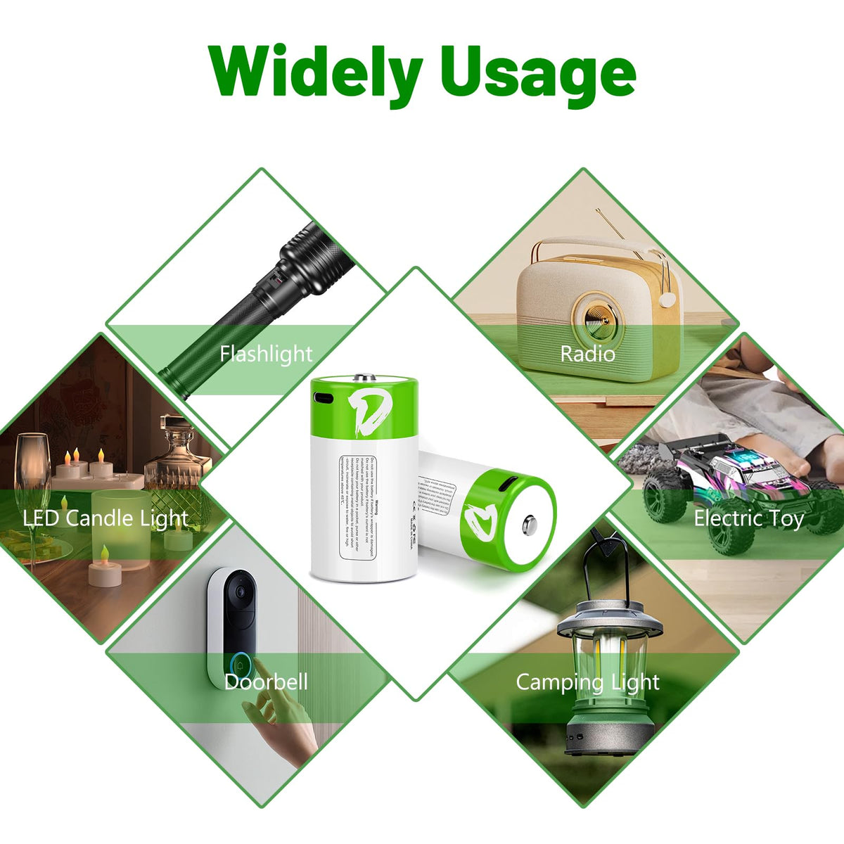 Q: How should I store the rechargeable D batteries?A: Store them in a cool, dry place away from direct sunlight. This helps maintain their performance and longevity.