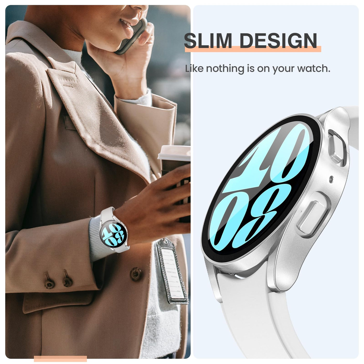 [2Pack] Tensea For Samsung Galaxy Watch 6 2023 Screen Protector Case 44Mm Accessories, Protective Face Cover For 44 Mm, Hard Bumper Built-In Tempered Glass Film For Women Men (44Mm, Sliver)