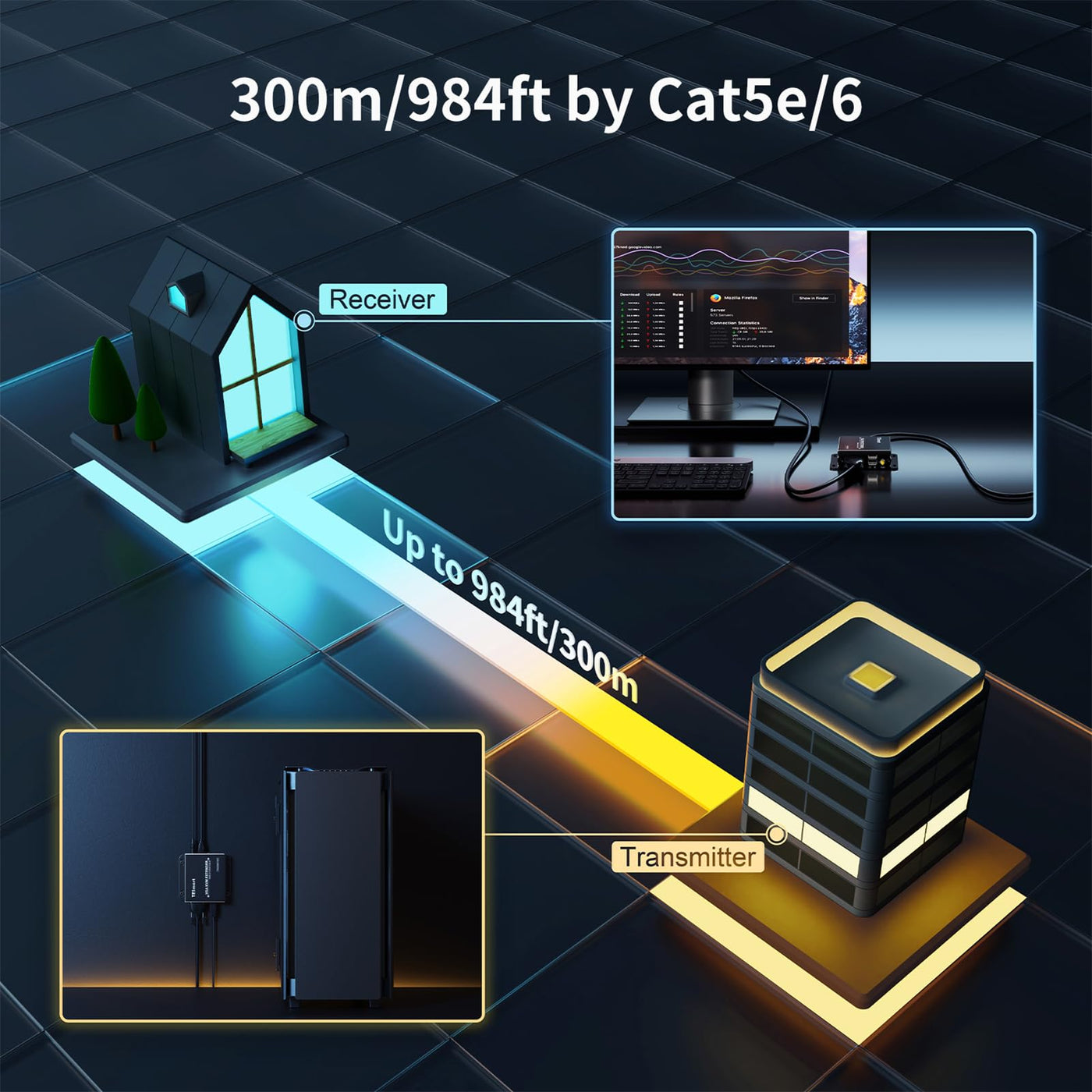 Q: What is the maximum distance the TESmart 1080P KVM Extender can transmit signals?A: The TESmart 1080P KVM Extender can transmit signals up to 984 feet (300 meters) using a single Cat5e or Cat6 Ethernet cable.