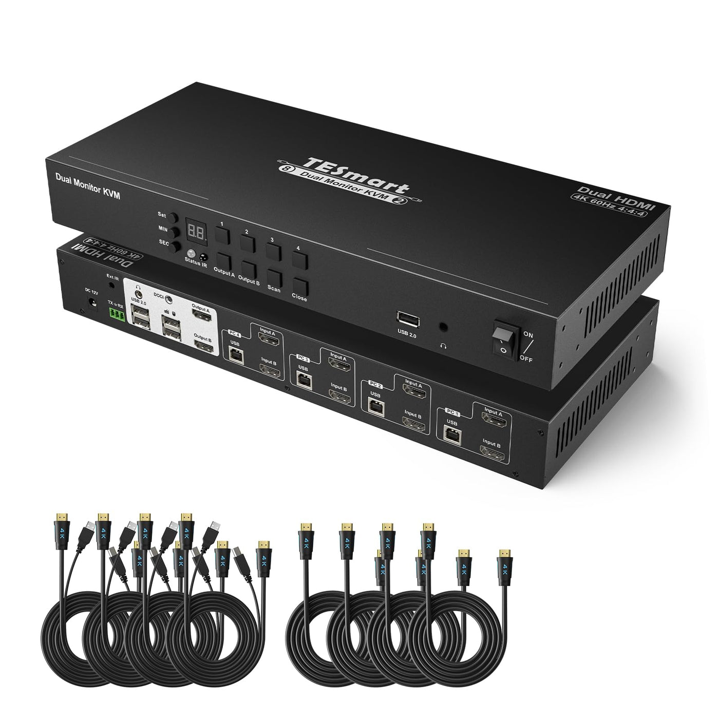 This Is The Latest Breakthrough In The History Of Hdmi Dual-Monitor Kvm. Now You Can Connect More Computers And More Monitors Through Hdmi Ports! A. If You Have One This Tesmart Dual-Monitor Kvm, Your Four Computers Can Switch At Any Time In Dual-Monitor Mode For Work, Games, Entertainment, Etc., Which Is Very Convenient. B. If You Have Two This Tesmart Dual-Monitor Kvms, Your Four Computers Can Switch At Any Time In The Quad-Monitor Mode, Ultra-Widescreen Immersive Gaming Experience, Multi-Monitor Display Of Stock Information, Etc. As Long As Your Computers And Monitors Support Dual Monitors Or Quad Monitors, Then You Can Connect To Our Kvm To Achieve Dual Monitors Or Quad Monitors. Features: 1. Support Unix/Windows/Debian/Ubuntu/Fedora/Mac Os X/Raspbian/Ubuntu For Raspberry Pi And Other Linux Basicsystem; 2. Support Resolution Up To 3840*2160@60Hz; 3. Support Hot Plug, Disconnect Or Connect Devices To The Kvm At Any Time Without Turning Off Pc; 4. With Edid Emulators In Each Input Port, Keep Pcs Always Have Correct Information, Prevent Displays Setting Change While Switching Input Ports; 5. Support Front Panel Button, Keyboard Hotkeys, Ir Remote Control And Rs232 To Control Kvm; 6. Available To Use Keyboard And Mouse Without Any Delay After Switching Input Sources; 7. With Extra Usb 2.0 Port, It Is Possible To Connect Bar Code Scanner, Usb Hard Device Or Other Usb Device; 8. Support Keyboard And Mouse Pass Through Mode To Improve Kvm Compatibility; 9. Support Dcci For Cascading, Achieve&Nbsp;Quad-Monitor. Packing List: 1 X Dual Monitor Hdmi Ports Kvm Switch 1 X Ir Remote Control (Aaa Battery Not Includeded) 1 X Ir Receiver Cable 1 X Dc 12V Power Adapter 1 X 3 Pins Connector (For Rs232) 2 X Rack-Ears 1 X Aux Cable For Dcci 1 X User Manual