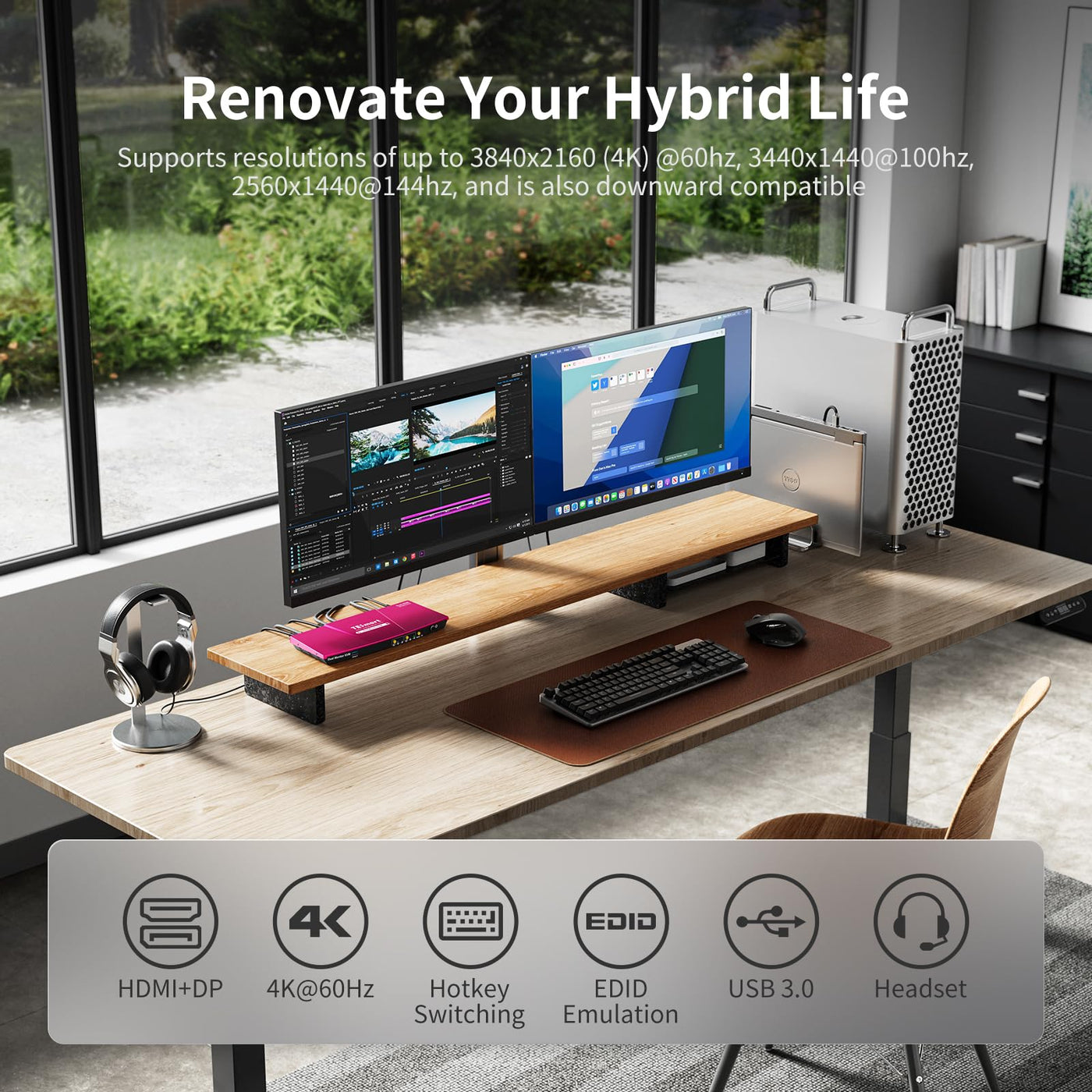 ?Displayport+Hdmi Kvm Switch 2 Monitors 2 Computers?Ideal For Access 2 Desktops Or Laptops With 2 Monitors And 1 Set Of Keyboard Mouse. You Can Easily Have A Dual Monitor Setup Per System Or Switch It To A Single Monitor System Showing Both Systems (One On Each Monitor) And Then Easily Toggle The Keyboard/Mouse Between The 2 Systems. | ?''Blast, Fast, Past'' With 2 Usb 3.0?The Integrated Usb 3.0 Ports Allow You To Share Usb Peripherals Like Printer, Scanner, Webcam And Hard Disk Between 2 Computers With Data Transfer Rate Up To 5Gbp/S (10 Times Faster Than Usb 2.0); The Usb 3.0 Ports On The Front Panel Can Charge Your Phone.Separate Toggle Buttons On The Panel Support Switching Images On Each Display Separately (I.E. Display Mode 2). | ?Ultra Hd 4K@60Hz And Edid Emulators?The Resolution Is Up To 3840X2160 (4K) @60Hz, 3440X1440@100Hz, And Downward Compatible, Support 3D, Hdr10, Hdcp2.2, And Dolby Vision Delivering More Exquisite And Authentic Video On Your Screen. With Edid Emulators In Each Input Port, Your Computers Always Receive The Correct Display Information And Preventing Displays Setting Change While Switching Inputs In Display Mode 1. Free You From The Hassle Of Constantly Adjusting Display Settings. | ?High Compatibility With Your Keyboards And Mice?2 In 2 Out Kvm Switches Suitable For Most Keyboards And Mice On The Market Because Of The Newest Upgraded Pass-Through Mode (Semi-Ddm Usb) . Support Wired, Wireless, Mechanical, Multimedia, And Gaming K&M (Not Support Wireless Bluetooth K&M). | ?Switching With Efficiency And Ease? Dp+Hdmi 2 Monitor Kvm Provides 3 Switching Options To Suit Your Needs. Whether You Prefer Using The Ir Remote(Aaa Batteries Not Included), Button Or Hotkeys, You Can Easily Switch Between Dp And Hdmi Sources And Manage Your Devices With Ease.