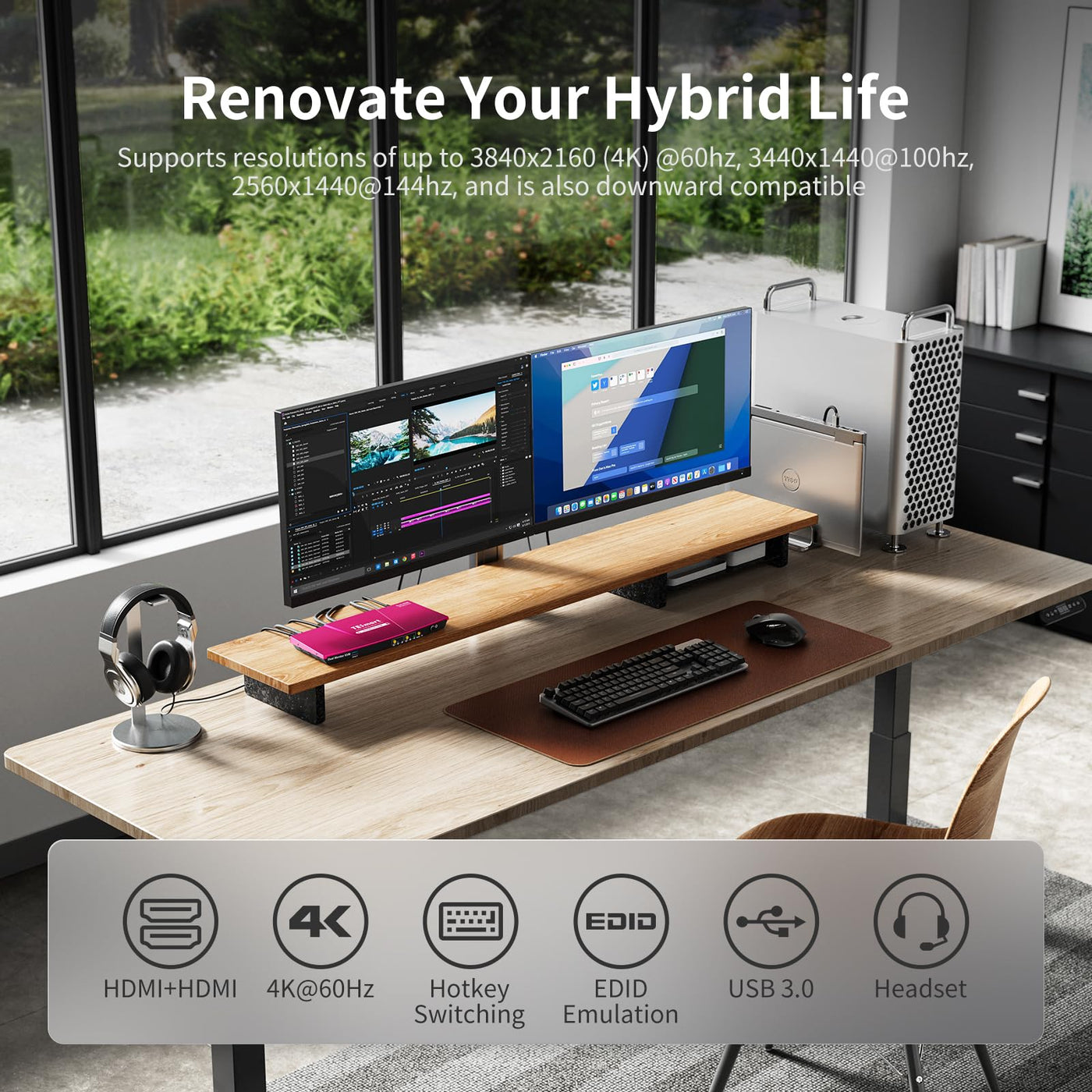 ?Kvm Switch 2 Monitors 2 Computers? Ideal For Access 2 Desktops Or Laptops With 2 Monitors And 1 Set Of Keyboard Mouse. You Can Easily Have A Dual Monitor Setup Per System Or Switch It To A Single Monitor System Showing Both Systems (One On Each Monitor) And Then Easily Toggle The Keyboard/Mouse Between The 2 Systems. You Can Also Change Hot Key Combinations, The Default Is [Right-Ctrl] Key, And The Alternative Are The [Scroll Lock] And [Left-Ctrl] Key. | ?''Blast, Fast, Past'' With 2 Usb 3.0?The Integrated Usb 3.0 Ports Allow You To Share Usb Peripherals Like Printer, Scanner, Webcam And Hard Disk Between 2 Computers With Data Transfer Rate Up To 5Gbp/S (10 Times Faster Than Usb 2.0); The Usb 3.0 Ports On The Front Panel Can Charge Your Phone.Separate Toggle Buttons On The Panel Support Switching Images On Each Display Separately (I.E. Display Mode 2). | ?Ultra Hd 4K@60Hz And Edid Emulators?The Resolution Is Up To 3840X2160 (4K) @60Hz, 3440X1440@100Hz, And Downward Compatible, Support 3D, Hdr10, Hdcp2.2, And Dolby Vision Delivering More Exquisite And Authentic Video On Your Screen. With Edid Emulators In Each Input Port, Your Computers Always Receive The Correct Display Information And Preventing Displays Setting Change While Switching Inputs In Display Mode 1. Free You From The Hassle Of Constantly Adjusting Display Settings. | ?High Compatibility With Your Keyboards And Mice?2 In 2 Out Kvm Switches Suitable For Most Keyboards And Mice On The Market Because Of The Newest Upgraded Pass-Through Mode (Semi-Ddm Usb) . Support Wired, Wireless, Mechanical, Multimedia, And Gaming K&M (Not Support Wireless Bluetooth K&M). | ?Multi-System Compatibility? Tesmart Kvm Switch 2 Computers 2 Monitors Supports Various Operating Systems Including Unix, Windows, Debian, Ubuntu, Fedora, Mac Os X, Raspbian, Ubuntu For Raspberry Pi And Other Linux Basic Systems, Making It A Versatile Selector For Multiple Devices To Be Used Flexibly With Different Os Without The Need For Additional Software Or Drivers. Note: Please Make Sure Your Laptop Is Capable Of Dual Monitors Before Purchasing.
