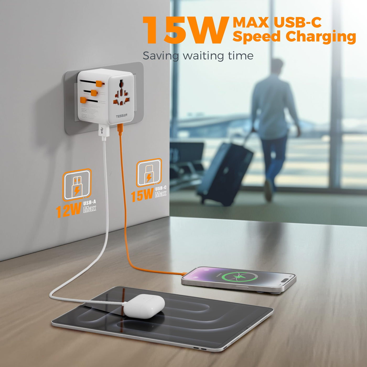 Q: How many devices can I charge simultaneously with this travel adapter?A: You can charge up to 7 devices simultaneously using the TESSAN Universal Travel Adapter, which features 2 AC outlets and 5 USB ports (including 3 USB-C ports).