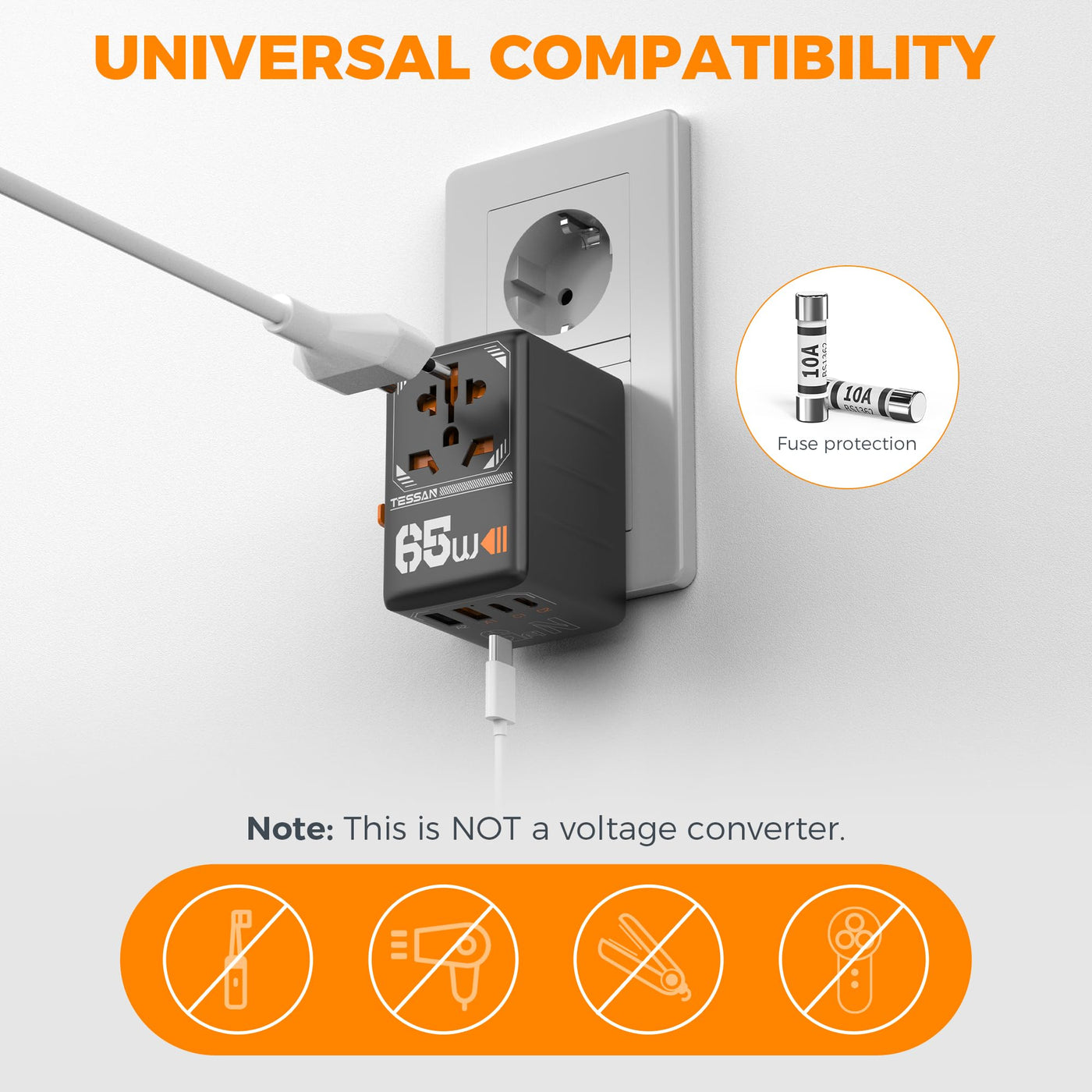 Q: Is the TESSAN Universal Travel Adapter suitable for high-wattage devices?A: Yes, the adapter includes a GaN 65W USB-C port that can charge devices quickly. It supports a wide voltage range of 100V to 250V, making it suitable for high-wattage devices like laptops and other electronics.