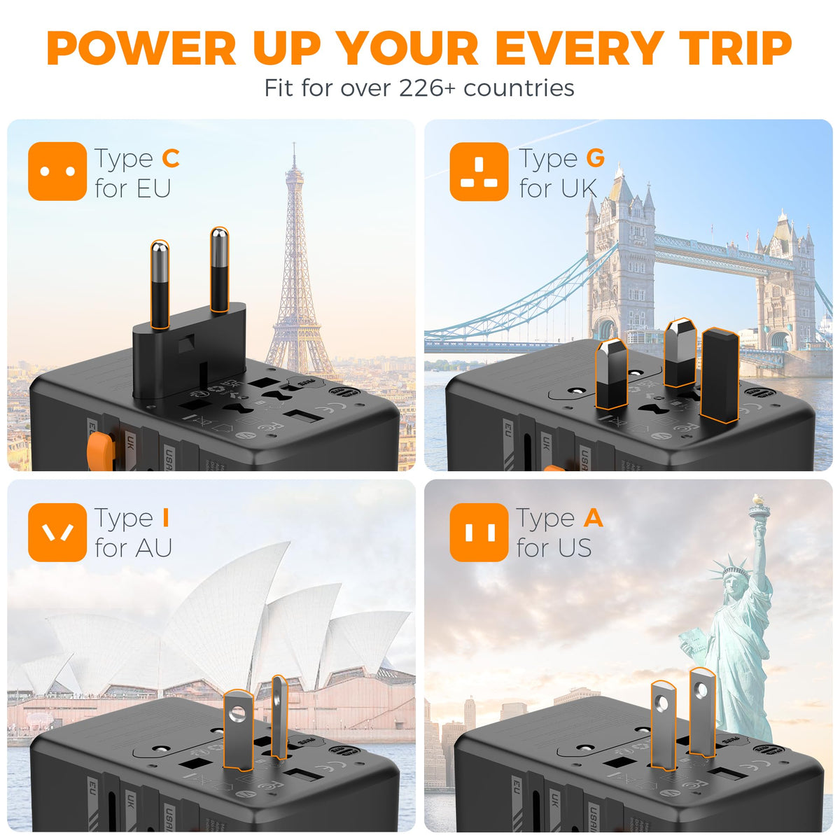 5 In 1 Universal Travel Adapter With 2 Usb-C, 2 Usb-A, Is Compatible For Use In Over 200 Counties With 4 Types Of Plugs( Type C, Type G, Type A, Type I); Suitable For Worldwide Devices With Multiple Plugs(Type B, Type C, Type G, Type A, Type E/F, Type I );Idea For Traveler, Students, Business Man To Use When Travel Abroad.