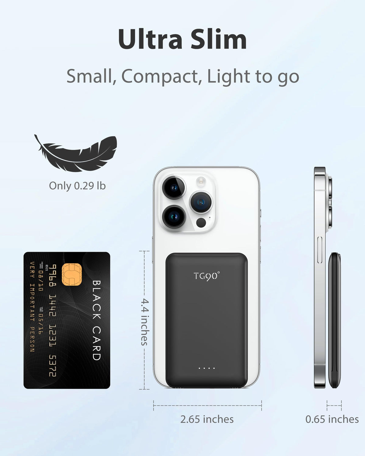Q: What is the size and weight of the TG90° Portable Charger?A: The TG90° Portable Charger is designed to be compact and portable, measuring 4.4 x 2.7 x 0.65 inches and weighing only 0.29 pounds, making it easy to carry in your pocket or bag.