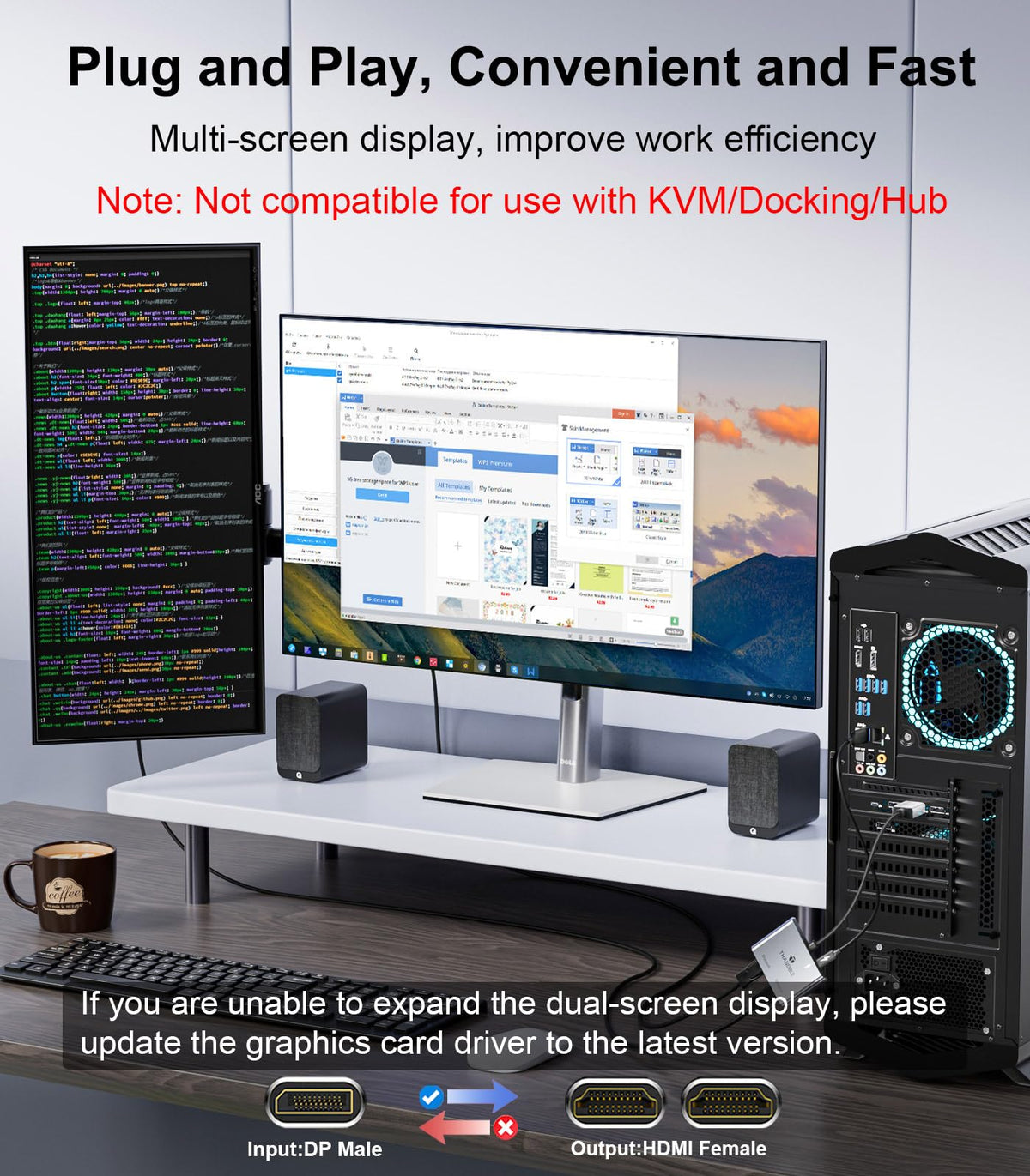 Q: Is this adapter compatible with all devices?A: Yes, this adapter is compatible with devices that have DP/DP++/DisplayPort++ source ports, including desktop computers and graphics cards from brands like HP, Dell, Lenovo, AMD, and NVIDIA. Ensure your graphics card supports a bandwidth of more than 18Gbps for optimal performance.
