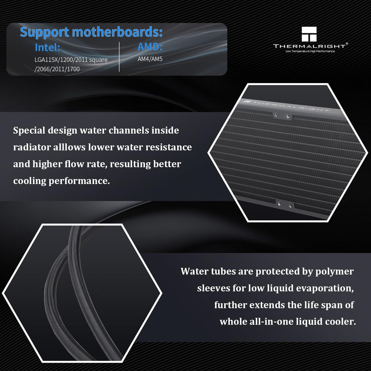 Q: What are the key features of the Thermalright Frozen Edge 240 Black AIO Water Cooler?A: The Thermalright Frozen Edge 240 Black AIO Water Cooler features a powerful cooling system with two 120mm PWM fans operating at a maximum speed of 2150 RPM, ensuring efficient heat dissipation. It also includes a fourth-generation pump with a lifespan of up to 40,000 hours, providing reliable performance. The cooler is designed with a low noise level, advanced thermal conductivity materials, and a wide compatibility range for various Intel and AMD CPUs.