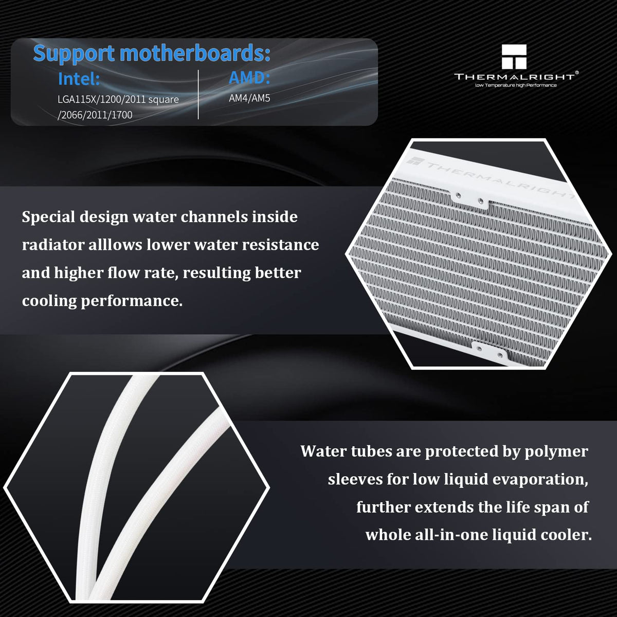Q: Is the Thermalright Frozen Prism compatible with AMD and Intel processors?A: Yes, the Thermalright Frozen Prism 240 White ARGB Liquid CPU Water Cooler is compatible with various AMD and Intel processors. It supports AMD AM4 and AM5 sockets, as well as Intel 1700, 1150, 1151, 1200, and 2011 sockets, making it a versatile choice for different CPU setups.