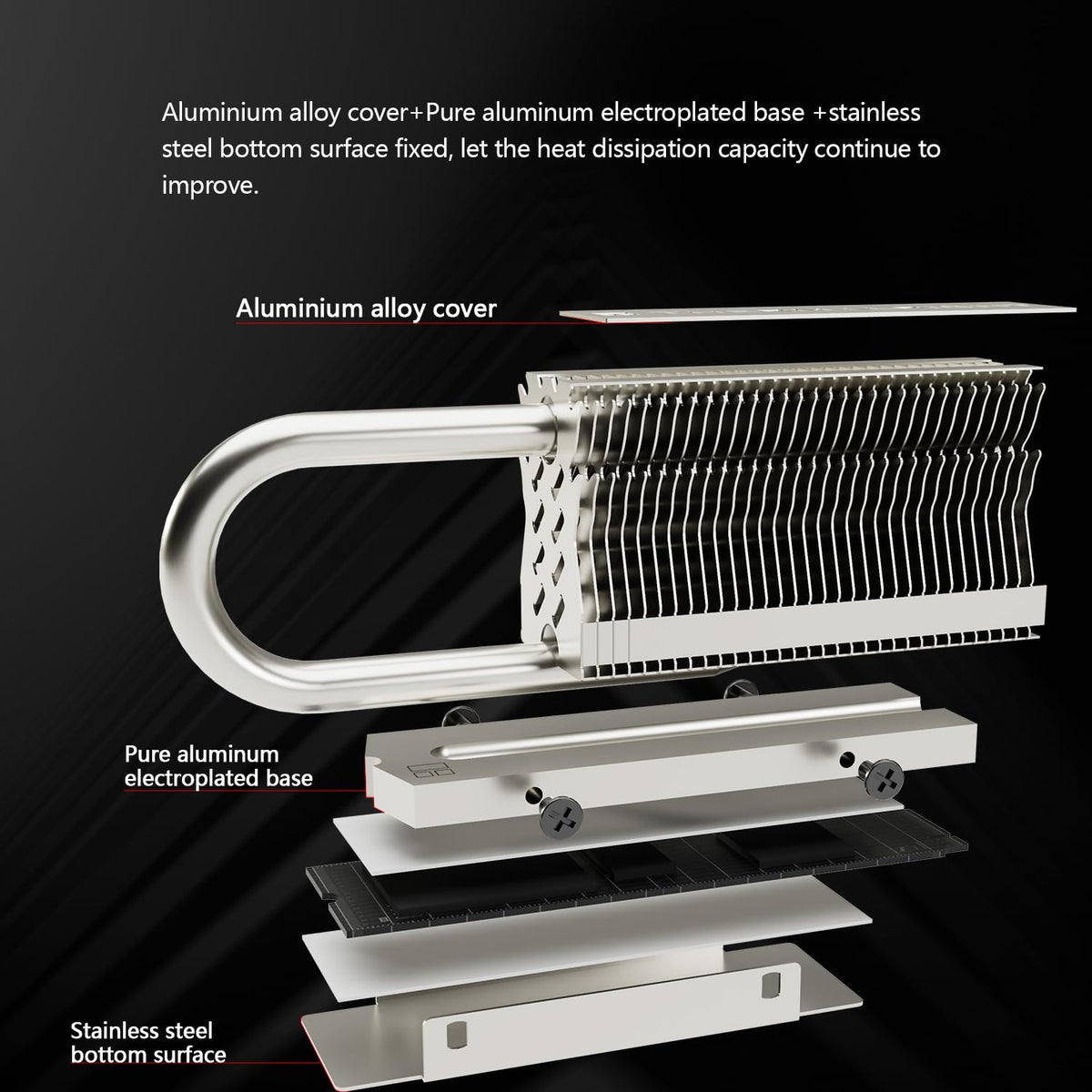 Product Parameters: All Aluminum Heat Sink/Anodic Sandblasting Process/Mirror Laser Engraving Logo/2280 Specifications/Double Layer Silicone Sheet Size:79*24*48Mm; Body Material:Aluminum Alloy; Color:Silver Gray; 6Mm 1 Aghp Generation 3 Reverse Gravity Heat Pipe; Pure Aluminum Electroplating Base; Carry 14.8W/M.K Double-Sided Second-Generation Odyssey Silicone Pad;4500Mm Heat Dissipation Area; Number Of Fins: 32Pcs; Thickness=1.8Mm Gap Aluminum Fins &Nbsp; Package Contents: Radiator X1