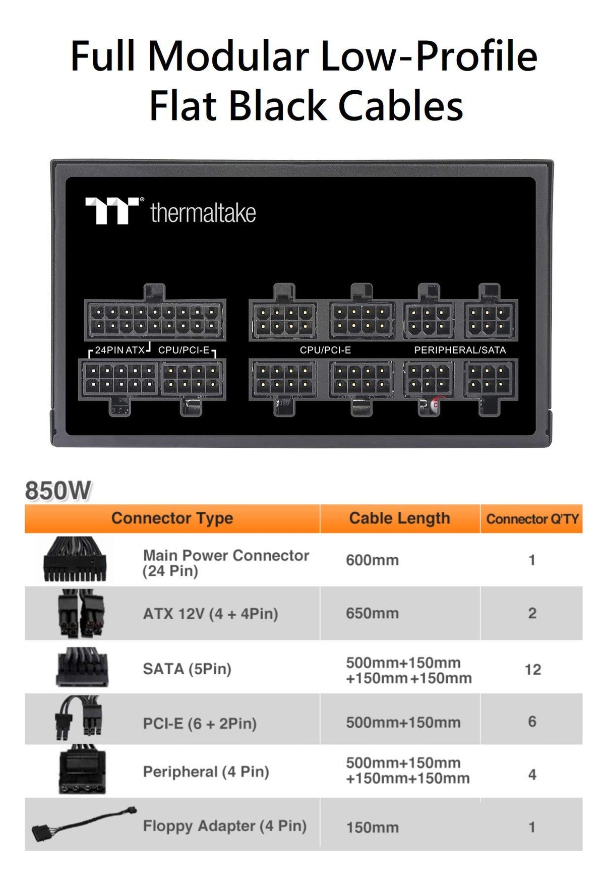 The Fully Modular Toughpower Gf1 Series Is Available In 650W - 850W Models And Built To Deliver 80 Plus Gold Efficiency The Series Features A 140Mm Hydraulic Bearing Fan, Japanese Capacitors And Other Premium Components To Help Deliver A Continuous And Stable Power With An Ambient Temperature Up To 50Ac, While Near Silent Operation And Reliable Performance Are With An Ample 10-Year , The Toughpower Gf1 Is Able To Satisfy The Market, Where Pc Enthusiasts Are Looking For A Premium Power Supply With All The Latest Features The Thermaltake Toughpower Gf1 850W Is An Excellent Product - Toms Hardware The Thermaltake Toughpower Gf1 850W, Besides A Cool Rgb Lighting, Achieves High Performance, And It Also Sports A Fairly Quiet Operation - Toms Hardware Pn: Ps-Tpd-0650Fnfagu-1 Watts: 650W Rgb Fan: No Model: Ttp-650Ah3Fcg Max Output Capacity: 650Wpeak Output Capacity: 780W Color: Black Dimension ( W H D ): 150Mm(W) X 86Mm(H) X 160Mm(D) Pfc (Power Factor Correction): Active Pfc Power Good Signal: 100-500 Msec Hold Up Time: > 16Msec At 100% Of Full Load Input Current: 10A Input Frequency Range: 50Hz - 60Hz Input Voltage: 100V - 240V Operating Temperature: 0Ac To + 50Ac Operating Humidity: 20% To 90%, Non-Condensing Storage Temperature: -20Ac To + 70Ac Storage Humidity: 5% To 95%, Non-Condensing Cooling System: 14Cm Hydraulic Bearing Fan Efficiency: Meet 80 Plus Gold At 115Vac Input Mtbf: 120, 000 Hrs Minimum Safety Approval: Cectuvustav Sadfccbsmieac Pci-E 6+2Pin: 4 Protection: Ocp, Ovp, Uvp, Opp, Scp, Otp