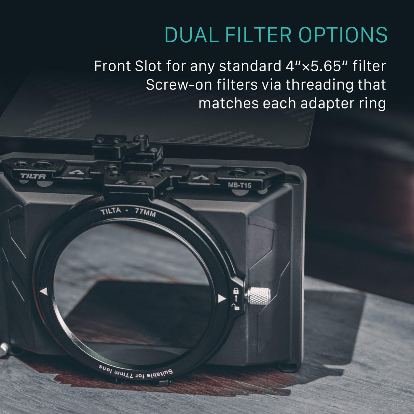 Q: What types of filters can I use with the Tilta Mini Matte Box?A: The Matte Box supports a single 4x5.65 filter and allows for stackable circular filters, providing flexibility for your shooting needs.
