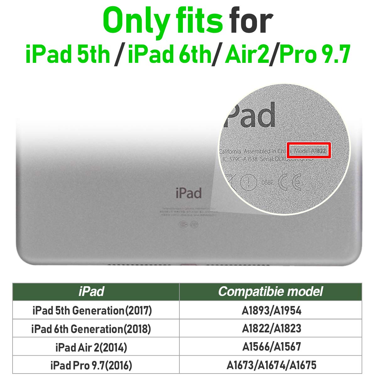 Compatible With Compatible With Ipad Tablets Below Only: Compatible With Ipad 9.7 Inches 2018/Compatible With Ipad 6Th Gen [A1893, A1954] Compatible With Ipad 9.7 Inches 2017/Compatible With Ipad 5Th Gen [A1822, A1823] Compatible With Ipad Pro 9.7 Inches [A1673, A1674, A1675] Compatible With Ipad Air 2 [A1566, A1567] Will Not Fit For Other Compatible With Ipad Models. Please Check Your Tablet Model Carefully Before Purchase. Main Features 3 Layers Of Protection, With A Shock-Resistant Ruggged Polycarbonate Frame, And Surrounded By A Shock-Absorbing Soft Silicone Bumper.Volume, Power And Mute Switches Are Covered. And Hinged Plugs Seal The Dock Connector And Headphone Port When You'Re Not Using Them.Designed For Kids, Students Etc.Production From Rain, Mud, Sand, Snow, Dust, And Other Environmental Factors.With Built-In Screen Protector And The Raised Edges Can Protector Your Lens And Screen. With Built-In 360 Degree Rotatable Swivel Kickstand That For Positioning Your Tablet For Watching Videos, Chatting Or Typing. Removable Portable Shoulder Strap Can Hang From Your Shoulder, Neck, Or Somewhere For Travel, Or Allows You To Display Your Tablet Behind One Seat For Personal Viewing Or Between Two Seats For Shared Viewing.Tips:The Straps' Total Circumference Is 126 Cm (49 Inches), While You Put It On Your Shoulder It'S As Long As 68 Cm (26.7 Inches), The Width Is 2.5 Cm (1 Inch).Products Contents1 X Compatible With Ipad 9.7 Inches 2018 6Th Gen/Compatible With Ipad 9.7 Inches 2017 Compatible With Ipad 5Th Gen/Compatible With Ipad Pro 9.7 Inches/Compatible With Ipad Air 2 Case 1 X Hand Strap 1 X Shoulder Strap 1 X Cleaning Cloth 1 X Installation Tool 1 X User Manual Paper Card Installation Methodplease Check The Reverse Side Of The Paper Card, Or Contact Our 24- Hours Customer Services By Email.