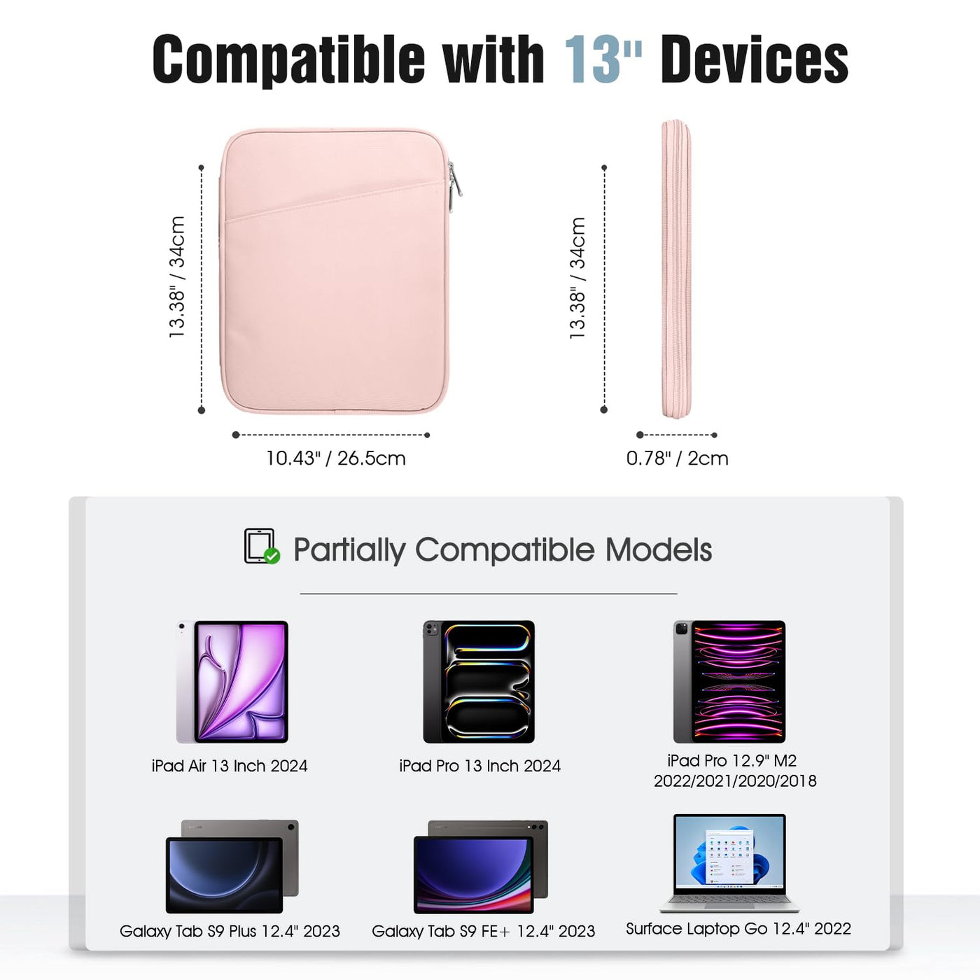 Compatibility - Designed For 13 Inch Tablets And Fits Smart Keyboard, Compatible With Ipad Air 13 Inch 2024, Ipad Pro 13 Inch 2024, Ipad Pro 12.9 M2 2022, Ipad Pro 12.9 M1 2021, Ipad Pro 12.9 3Rd/4Th Gen 2018-2020, Ipad Pro 12.9 1St Gen 2015 Tablet, 12 Inch New With Retina Display, Surface Pro X, Surface Laptop Go 12.4, Surface Pro 7, Surface Pro 6 12.3, Surface Pro 4/3, Surface Pro Lte 12.3 Inch, Galaxy Tab Pro S 12.2, Galaxy Tab S9+ 12.4 2023, Galaxy Tab S8+ 12.4, Matebook 12, Etc. | Premium Material - Made Of Premium Polyester Material, This Tablet Sleeve Carrying Case Is Splash-Proof And Sturdy, Which Can Effectively Keep Your Precious Tablet From Accidental Bumps And Scratches In Daily Use. | Multiple Pockets - This Sleeve Bag Comes With Multiple Compartments, Offering Enough Space For Your Tablet And Other Accessories Like Cables, Mouse, Earphone, Notes, Wallet, Cards And More Small Items. | Portable Bag - It Is Easy For You To Carry Outside With Its Compact Size. It Allows You To Easily Carry The Case By Hand And Slide Into Your Backpack, Briefcase Or Other Bags. Perfect For Carry While On-The-Go, Business Or Travel. | Specifications - External Dimensions: 13.38*10.43*0.78/34*26,5*2Cm; Internal Dimensions: 12.6*9.64*0.78/32*24.5*2Cm; Item Weight: 7.76 Oz (220 G). The Simple And Stylish Design Makes It Suitable For Any Occasions.