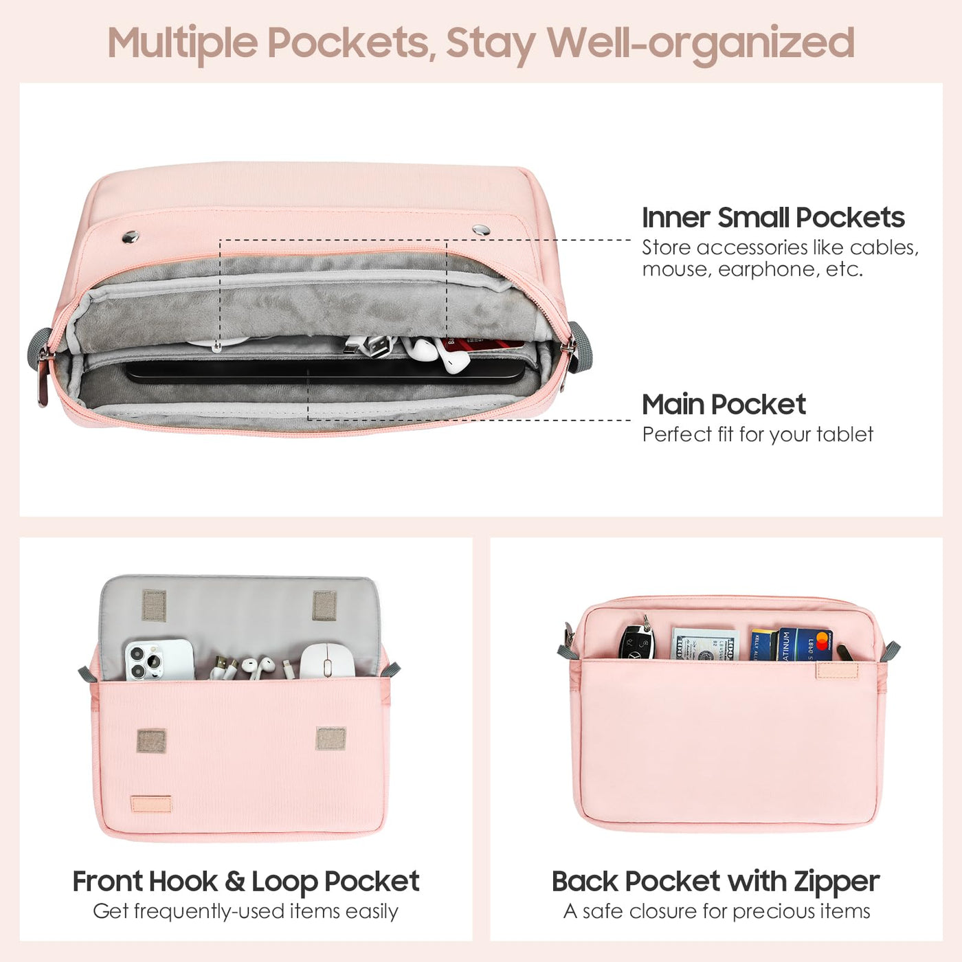 ?Compatibility?Designed For 9-11 Inch Tablets And Fits Smart Keyboard, Compatible With Ipad Air 11 Inch 2024, Ipad Pro 11 Inch 2024, Ipad Air 5 /4 10.9, Ipad 10Th10.9 2022, Ipad 9Th 10.2 2021/2020/2019, Ipad Pro 11 2022/2021/2020/2018, Ipad Air 3Rd Gen 10.5 Inch 2019, Ipad Pro 10.5 Inch 2017, Ipad 9.7 6Th / 5Th 2018/2017, Ipad 1/2/3/4, Ipad Air/Air 2, Fire Hd 10, Samsung Galaxy Tab A8 10.5, Galaxy Tab A7 10.4 2020, Tab S6 Lite 10.4 2020, Galaxy Tab S9/S8 11'' 2023/2022,Etc. | ?Premium Material & Superior Protection?Made Of High-Quality Polyester Fabric, This Tablet Bag Is Durable, Dust And Scratch Resistant, Which Ensures A Long-Lasting Durability And Protects Your Devices From Scratches And Dust. Thickened Cushioned Inter Layer Provides Excellent Protection Against Damage To The Inner Items During Daily Carrying. | ?Portable Design?Comes With A Convenient Shoulder Strap, Which Is Detachable And Adjustable, Allowing You To Carry Outside Easily. Perfect For On-The-Go, Business Or Travel. Slim And Lightweight Sleeve Easily Fits In Your Briefcase, Backpack, Suitcase, Etc, And Will Not Add Too Much Burden. | ?Large Capacity?The Tablet Sleeve Has Multiple Compartments: 1 X Main Compartment To Keep Your Tablet, 2 X Small Compartments For Accessories Like Cables, Mouse, Earphone, Wallet, Cards And Others. 1 X Outer Pocket To Store Your Daily Small Items Such As Tissues, Pens, Notes, Etc. 1 X Hidden Back Pocket For Your Valuables And Prevent Loss. | ?Dimensions?Outer Sizes: 12.6 X 9.4 X 1.5 In(32 X 24 X 4 Cm), Inner Sizes: 11.6 X 8.6 X 1.1 In(29.5 X 22 X 3 Cm). This Sleeve Case Fits Any Tablets Or E-Readers Under 11 Inch. Please Double Check The Size Of Your Device Before Purchase.