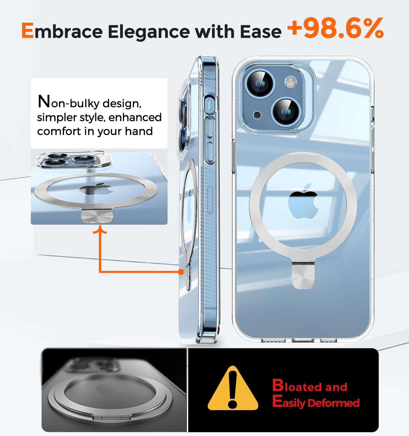 Q: How does the built-in MagSafe ring stand work?A: The built-in aluminum magnetic ring provides stable support for your iPhone 13/iPhone 14 in both portrait and landscape modes, and it remains invisible when not in use, offering a sleek design without any protrusions.