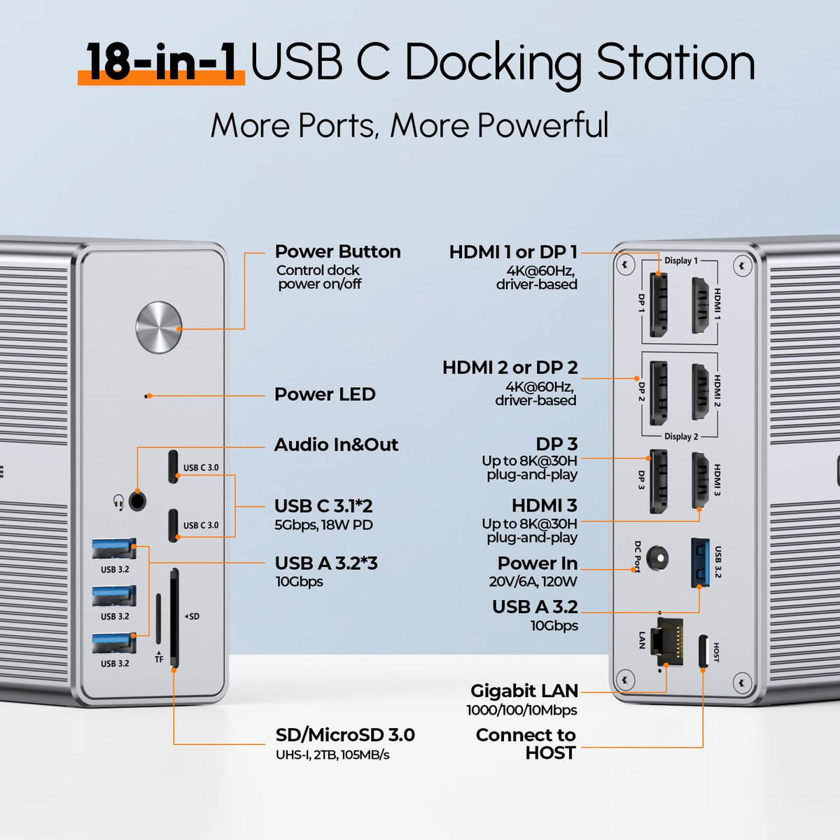 The Tobenone Universal 4K Triple Display Docking Station Uds033 Is The Ultimate One-Stop Upgrade For Thunderbolt 5, Thunderbolt 3, Thunderbolt 3, Usb4.0, And Full-Featured Usb-C Laptops: With It, You Will Get 18 External Ports, Allowing You To Add Multi-Monitors And Connect All Of Your Peripherals. All Through A Single Cable Connected To Your Laptop, Decluttering Your Workspace And Making It Easier To Do More Work In Less Time. Always Ready To Come And Go From Your Desk. Including: 3X Hdmi Port & 3X Displayport—Add Up To 3 Additional Displays For Macos, And Add Up To 4 Additional Displays For Windows. Get More Screen Space For More Productivity. 4X Usb A 3.1�Add A Thumb Drive, External Hard Driver, Printer, And More 2X Usb C 3.0�Add Phone, Ipad, And More, Support Data And Charging 1X 3.5Mm Audio Port—With Mic And Audio-Out Function 1X Sd/Tf 3.0�Support Work Simultaneously, Writing/Reading Speed Up To 105Mb/S 1X Gigabit Ethernet—Experience Fast And Reliable Ethernet Connection 1Xdc-In Port-Support 120W Input And 100W Max Charging Laptop, 18W Type-C Charging 1X Host—Single Usb-C Connection To Your Laptop 1Xpower Switch—Power On/Off The Usb-C Docking Station
