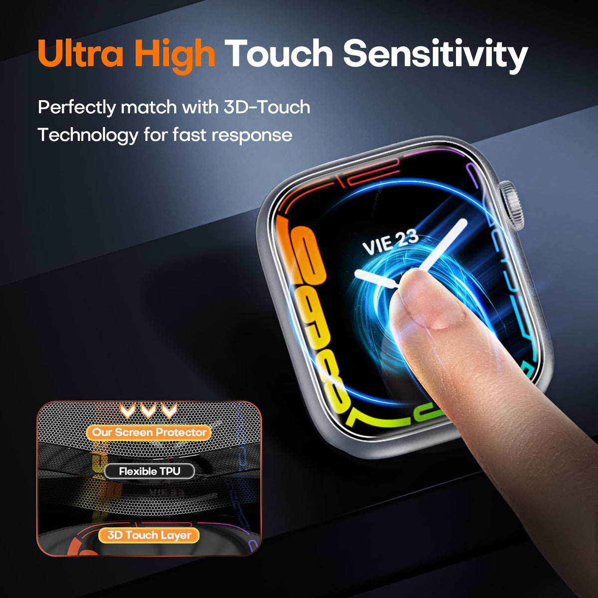 Q: Will the TOCOL Screen Protector affect the touch sensitivity of my Apple Watch?A: No, the TOCOL Screen Protector is designed with cutting-edge technology that ensures a smooth touch experience, allowing you to enjoy the same level of sensitivity as a naked screen.